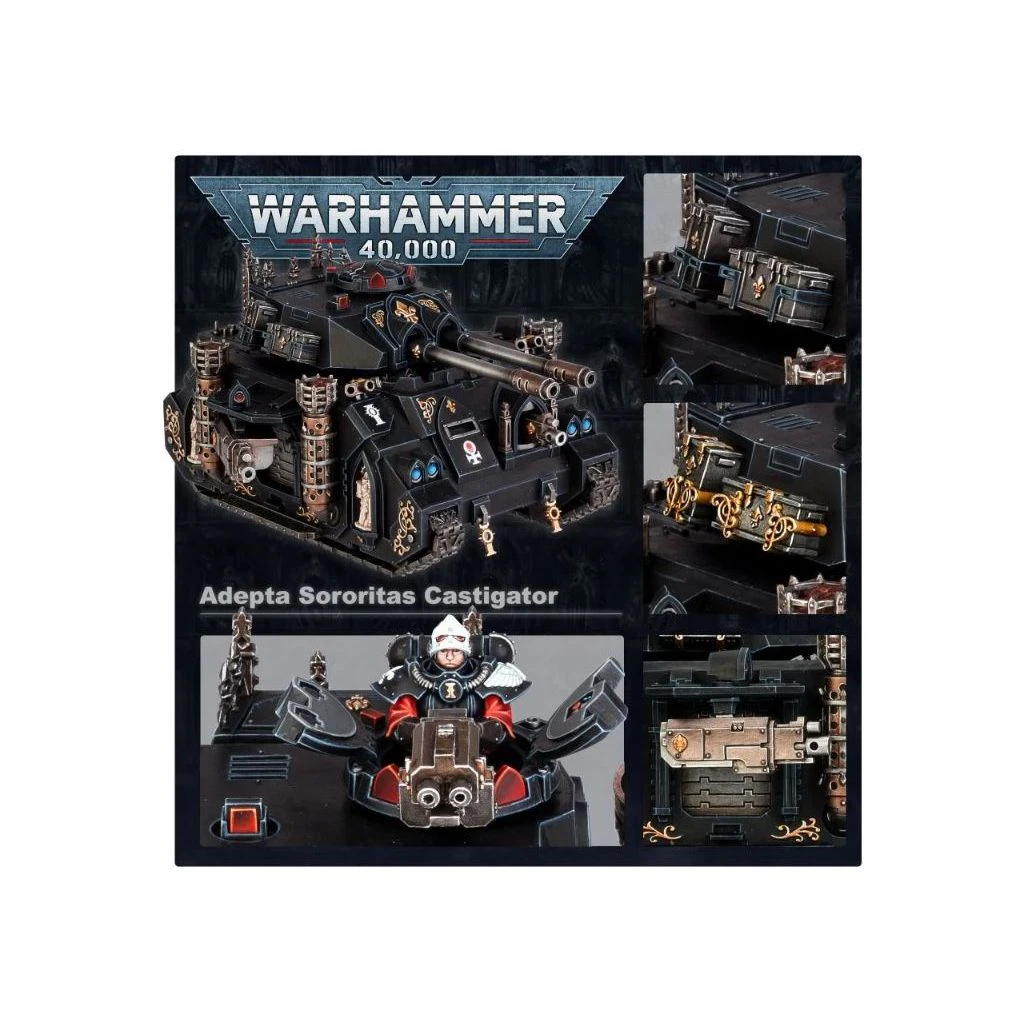 Le Castigator est une relique ancienne couverte d’ornements gothiques et d’iconographie classique de l’Adepta telle que la fleur de lis. On peut l’assembler avec un obusier Castigator ou des autocanons Castigator en guise d’armement principal, et il y a diverses options d’Ă©quipement et d’artilleuse, les braseros pouvant par ailleurs ĂȘtre montĂ©s de sorte Ă sembler allumĂ©s ou Ă©teints.