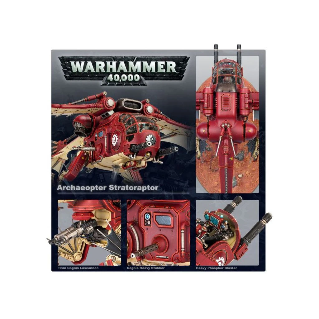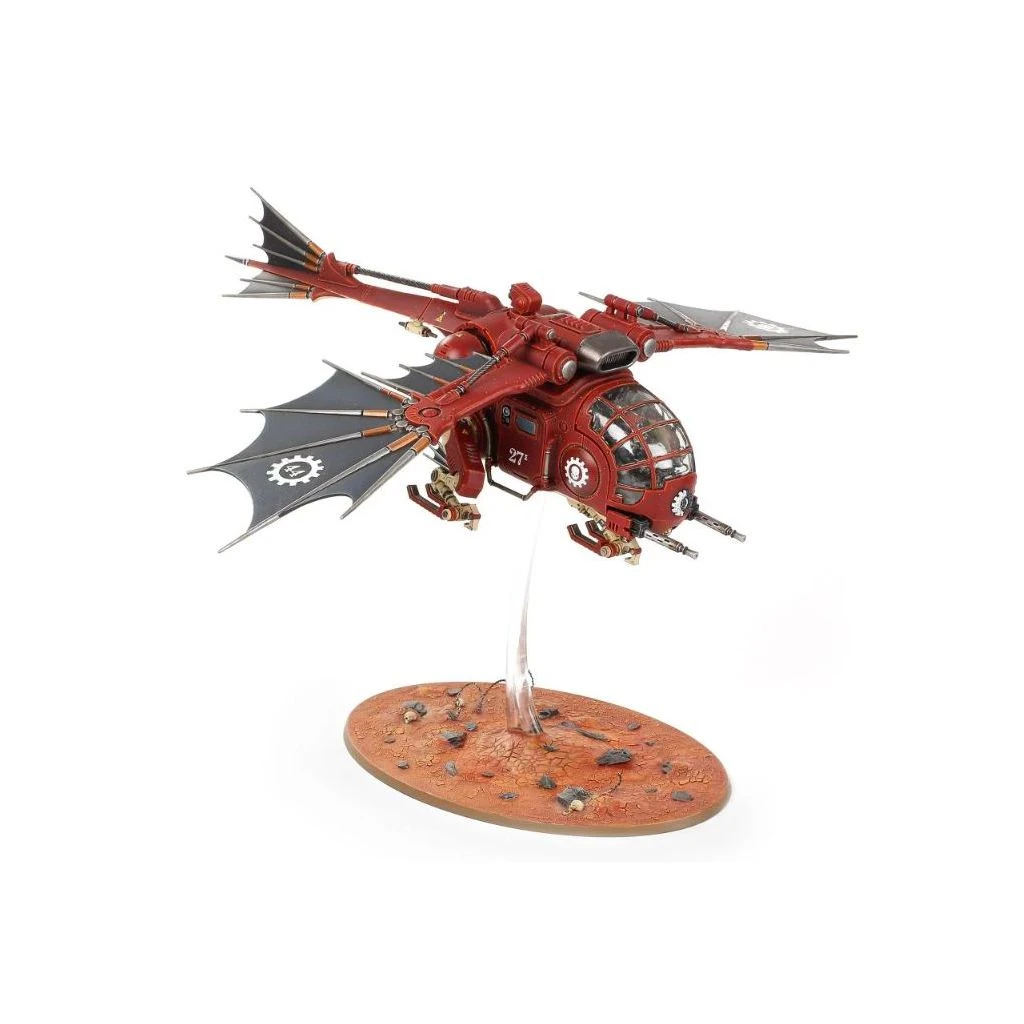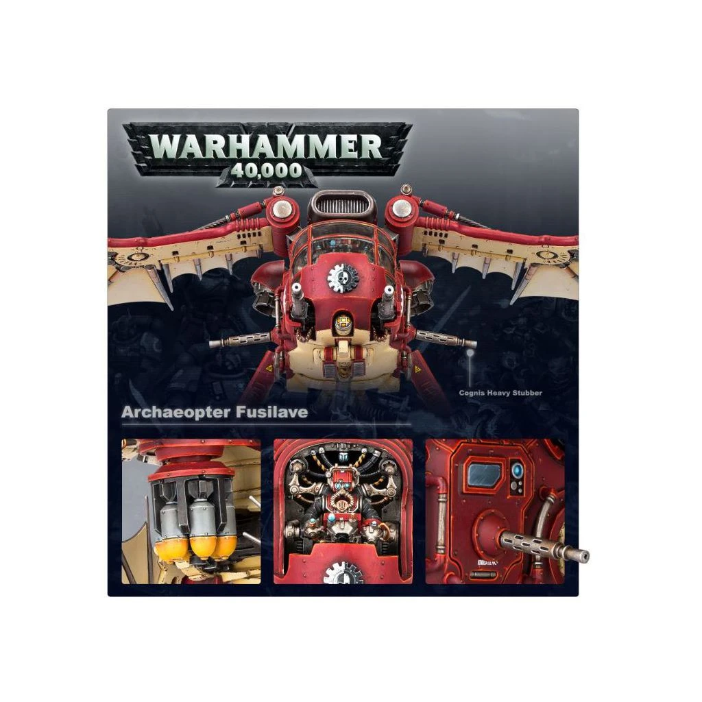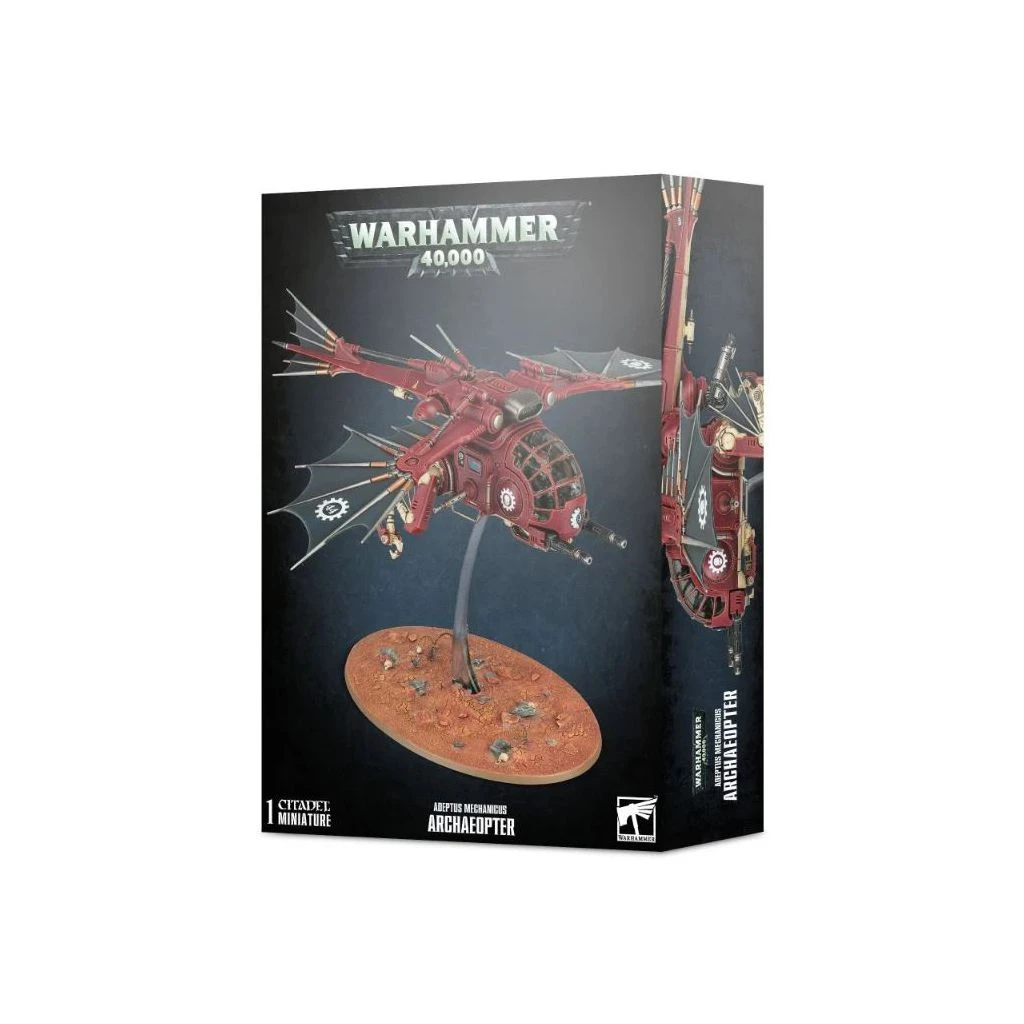 Bête de somme aussi bien des cieux martiens que des lointains mondes à l’avant-garde de l’expansion des Tech-Priests depuis des millénaires, l’Archaeopter est un agile aéronef à voilure fixe, piloté par un membre de la caste Pteraxii dont les jambes et les omoplates sont branchées aux commandes. Les nanofibres de carbone des ailes sont capables de morphose, tout comme les paquetages de vol des Pteraxii. Cela confère une grande maniabilité à l’appareil et lui permet de s’adapter aux changements de pression quand il fournit l’appui feu lourd, en saturant l’ennemi du feu nourri de son redoutable armement.