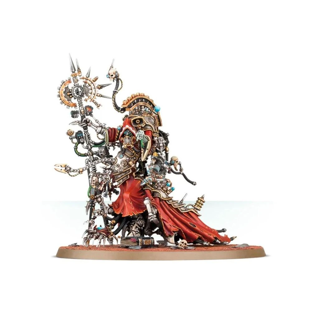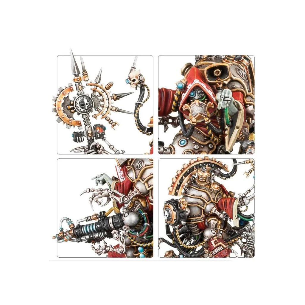 Ce kit plastique contient les composants nécessaires pour assembler Belisarius Cawl, Porte-parole de l’Omnimessie. Dominant ses frères de l’Adeptus Mechanicus, il est bien plus grand que même les Tech-Priests de l’Omnimessie, avec d’innombrables augmentations déformant sa silhouette à peine humaine. Il manie une hache de l’Omnimessie, qui sert également de point d’attache à différents capteurs et à son émetteur vocal, et un électrofléau – une arme à énergie occulte bardée de câbles, de senseurs et d’appendices. Le thème de l’augmentation se retrouve partout – la bure de Cawl ne dissimule guère sa pléthore d’extensions robotiques, dont des paires de membres locomoteurs, des bras préhensiles et des câbles qui lui font une traîne. Un augurocrâne flotte à proximité, et plusieurs symboles du Dieu-Machine ornent la figurines.