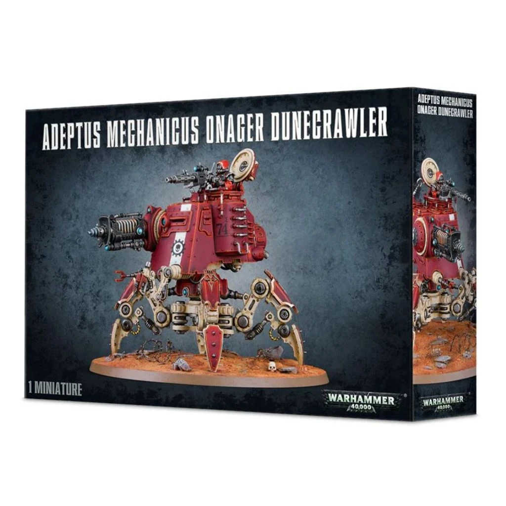 Ce kit plastique en 119 pièces, permettant d’assembler un Onager Dunecrawler, inclut une petite planche de décalcomanies de l’Adeptus Mechanicus et un socle rond de 130mm.