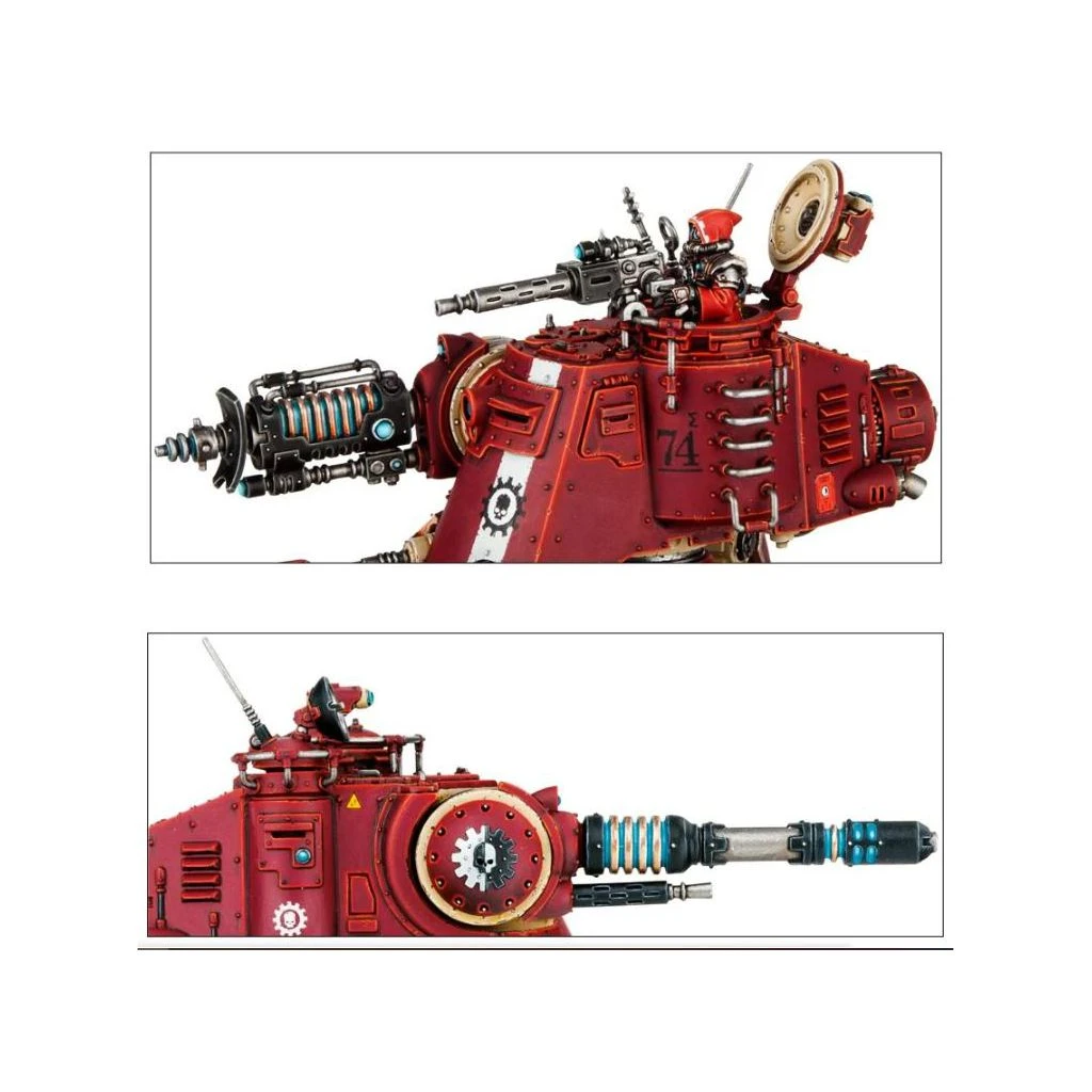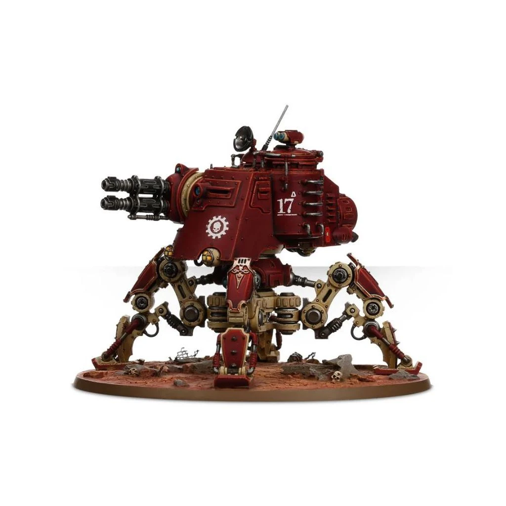 Char marcheur léger, l’Onager Dunecrawler est doté de quatre pattes de crabe avec blindage optionnel. La cabine et le réacteur blindés peuvent accueillir toute une variété d’options de modélisme: projecteurs, fumigènes, manipulateurs Cognis et sondes mentales. La coupole peut être ouverte ou fermée, avec ou sans Princeps servant une mitrailleuse. Avant même de choisir les armes, les possibilités de configuration et de personnalisation sont immenses.