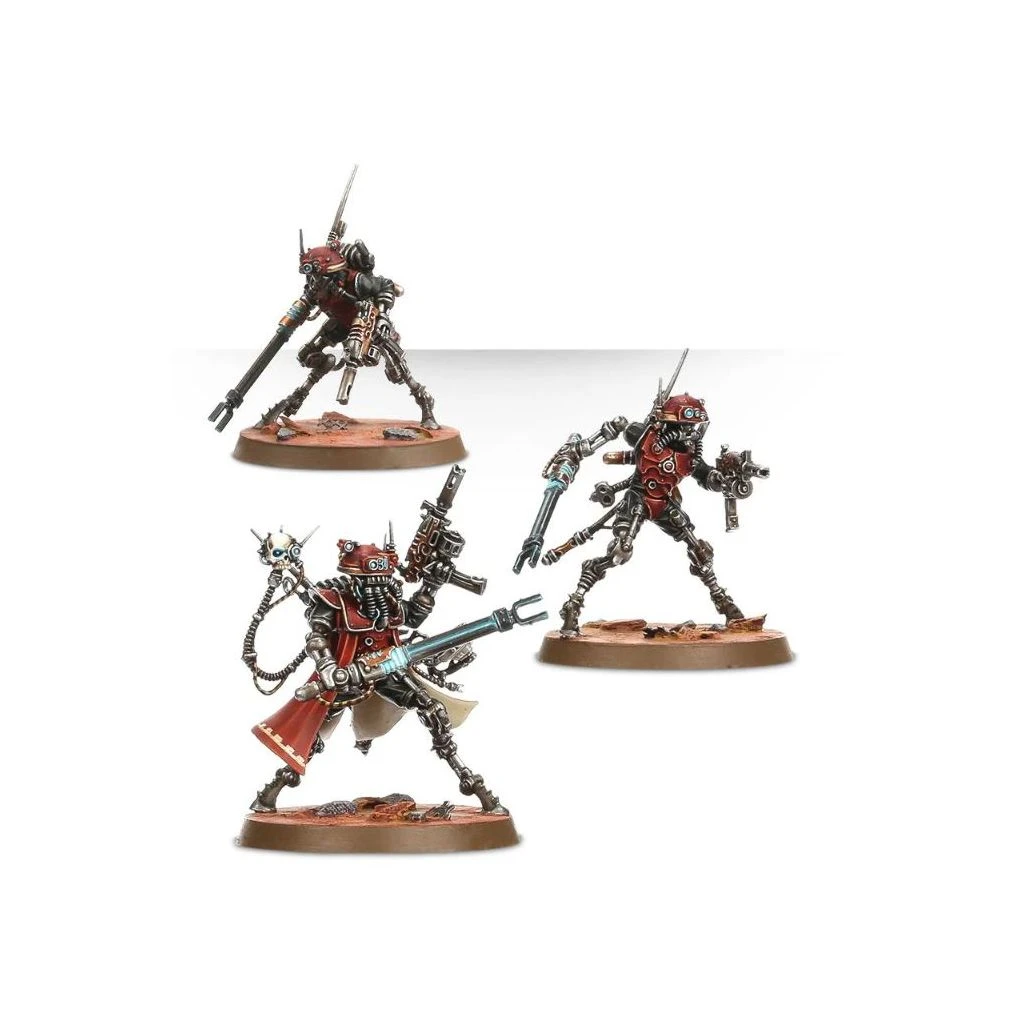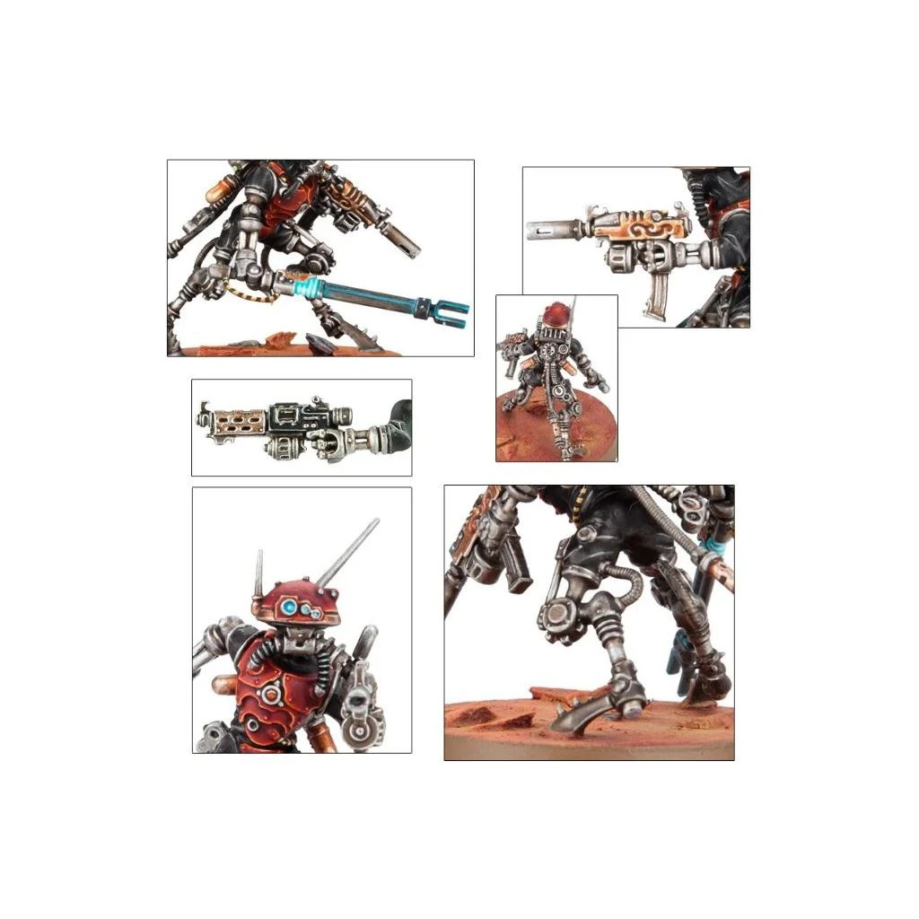 Ce kit plastique contient tous les composants requis pour assembler cinq Adeptus Mechanicus Sicarians – soit des Sicarian Ruststalkers, soit des Sicarian Infiltrators, y compris un princeps. Chaque figurine présente des modifications corporelles étendues, où la chair fait place à la machine, le reste étant cloîtré dans une armure pressurisée. Senseurs, capteurs de pression et transmetteurs de données leur tiennent lieu d’ornements, et vous pouvez personnaliser l’unité grâce aux diverses postures à donner aux cinq paires de jambes.