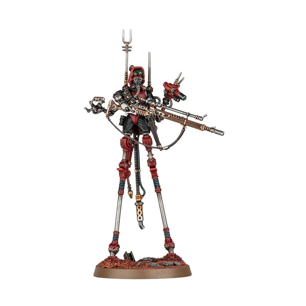 Ce kit plastique permet d’assembler un Skatros Sydonien, un sniper amélioré créé par l’Adeptus Mechanicus. Ce tireur d’élite skitarii peut être équipé d’un fusil à long canon parmi deux au choix: un jezzail à radium, qui tire des balles radioactives capables de percer les armures et d’empoisonner la chair, ou une puissante arquebuse transuranique. Chaque arme est dotée de son propre bras de chargement bionique, ainsi que d’un pack de munitions accroché à la ceinture du Skatros, auquel pend un pistolet pour les ennemis trop proches.
