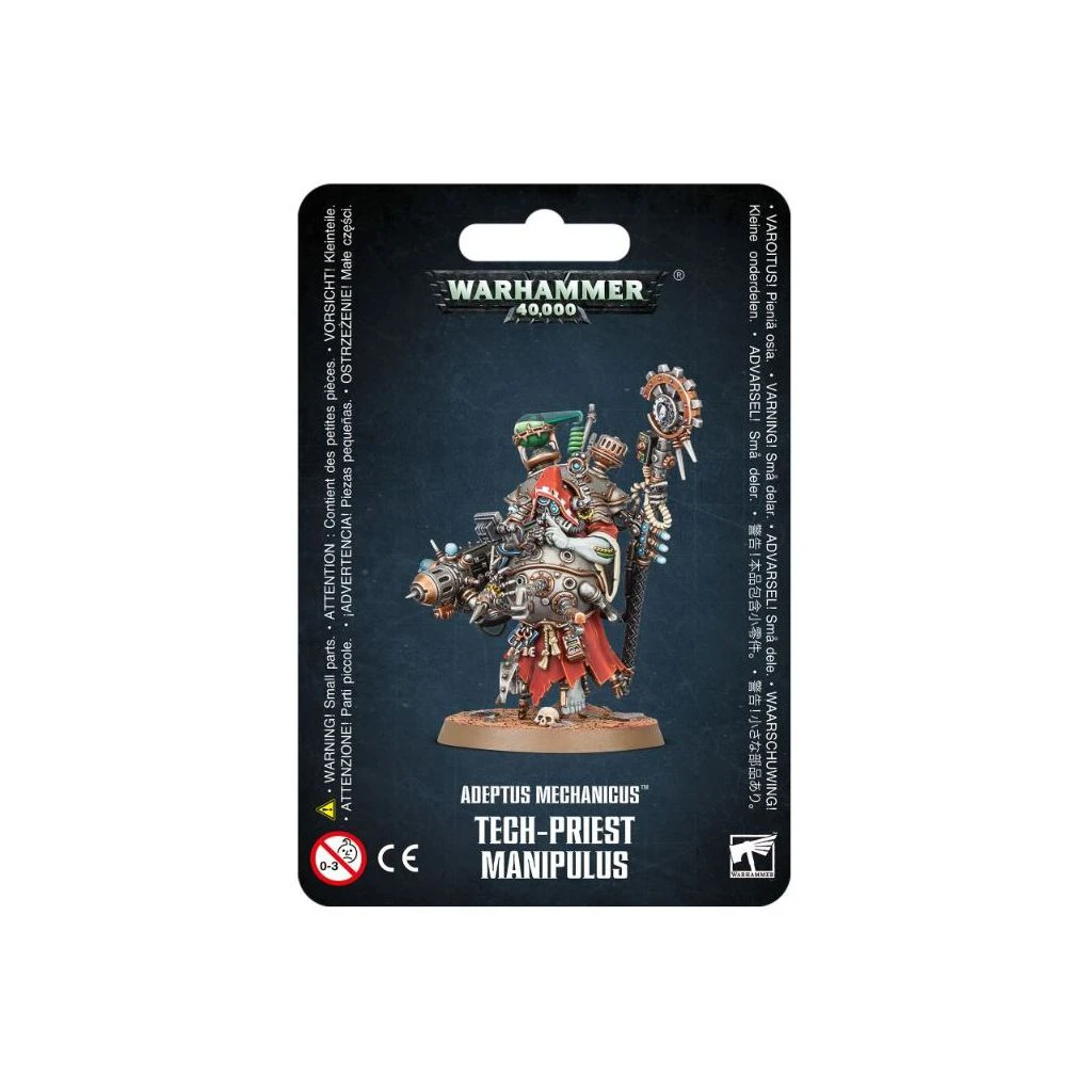 Les castes dominantes de l’Adeptus Mechanicus sont celles des Tech-Priests, des zélotes en robes dont la chair a été remplacée par des améliorations bioniques au fil du temps. Ces techno-savants portent tout un éventail de titres, et se spécialisent dans des savoirs ésotériques, étudiés avec une religiosité. Au coeur du bulbe bionique d’un Tech-Priest Manipulus se trouve une cellule galvanique, grâce à laquelle il peut canaliser une puissante charge de divine Force Motrice – le courant qui circule dans toute vie. Les Tech-Priests Manipulus cherchent avidement de nouvelles sources d’énergie, et les drainent à sec avec leur mécadendrites. Emplis de potentiel énergétique, ils alimentent les servants du Dieu-Machine et leurs saintes créations militaires. Les électropositeurs du Tech-Priest Manipulus surchargent les servomoteurs, les cellules des armes et les noyaux cérébraux. Saturés du pouvoir du Dieu-Machine, les guerriers mortels et les machines sacrées portent sa sainte parole tout en abattant les hérétiques.