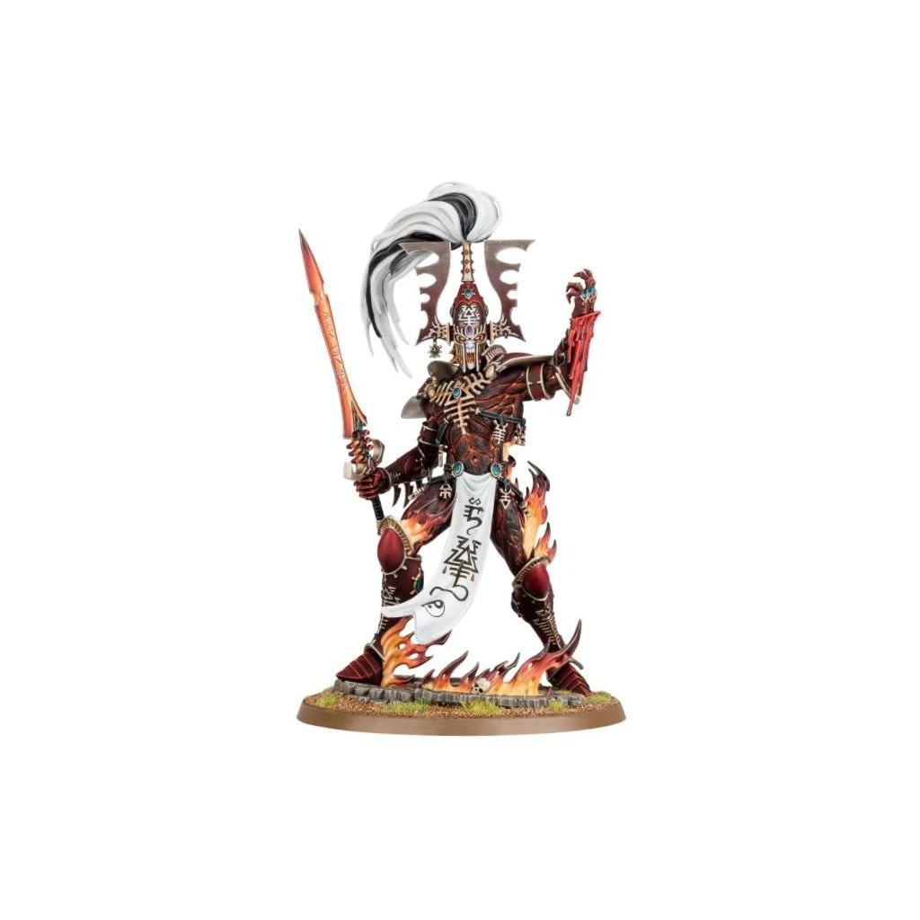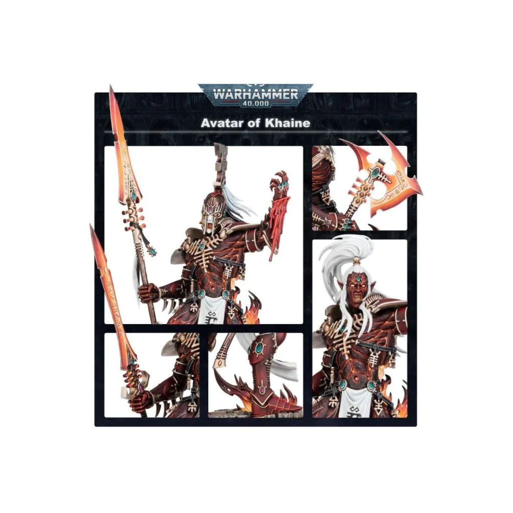 L’Avatar de Khaine est l’incarnation d’une antique déité guerrière – un fragment brûlant de Khaela Mensha Khaine, le Dieu à la Main Sanglante des Aeldari. Éveillé pour la bataille, il marche au travers des tirs ennemis sans ralentir le pas, et rit cruellement tandis que son arme – la Mort Hurlante – fend la chair et goûte le sang de l’ennemi à chaque frappe. La simple présence de l’Avatar instille une rage impitoyable chez les Asuryani qui l’entourent, son aura effroyable éradiquant toute peur et hésitation en faveur d’une soif de meurtre quasi insatiable. En pareils instants, les Aeldari semblent transformés en une vision des glorieux et terribles conquérants qui régnaient jadis sur la galaxie.