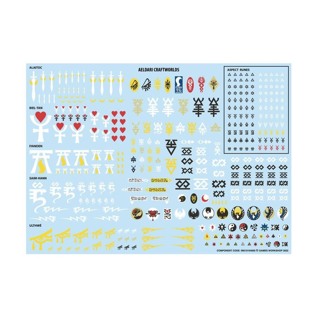 Ce kit est composé de 320 éléments en plastique, de 15x Socles Ronds Citadel de 28,5mm, de 5 Socles Ronds Citadel de 40mm et de 4x Socles Ronds Citadel de 25mm. Il inclut également 1x Planche de Décalcos Aeldari contenant 378x Décalcos de qualité pour décorer vos figurines.