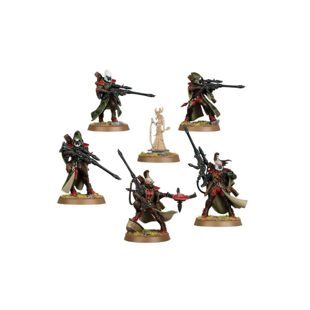 Ce kit permet d’assembler 5 Rangers Aeldari, des éclaireurs furtifs armés de longs fusils très précis, parfaits pour abattre les cibles clés. Chaque Ranger a deux options d’assemblage générant des poses variées, en train d’utiliser des jumelles ou de viser avec un pistolet shuriken, et un Ranger peut être assemblé en train de déployer un champ d’obscurité ou une toile à monofilaments. Il y a une sélection de 11 têtes pour l’unité: 3 avec casque, 3 avec casque et capuche, 3 têtes masculines, et 2 têtes féminines. Le kit inclut aussi un autel dédié à Kurnous le Chasseur, une divinité aeldari honorée par les Rangers.