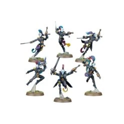 Cette boîte contient tout le nécessaire pour assembler une Troupe de 6 Harlequins armés d’épées et de pistolets shuriken, avec l’option d’inclure un Troupe Master. Il y a 6 paires de jambes, toutes perchées sur des reliefs rocheux destinés aux socles de vos figurines. Vous avez le choix entre 7 moitiés avant et 5 moitiés arrière de torses différentes, plus 3 dos en plus avec veste d’Harlequin. Il y a aussi 6 épées de deux modèles, 6 pistolets shuriken, 6 baisers d’harlequin, 2 étreintes d’harlequin, 2 caresses d’harlequin, 2 neuro disrupteurs et 2 pistolets à fusion. Il y a enfin une épée énergétique si vous souhaitez en équiper votre Troupe Master.
