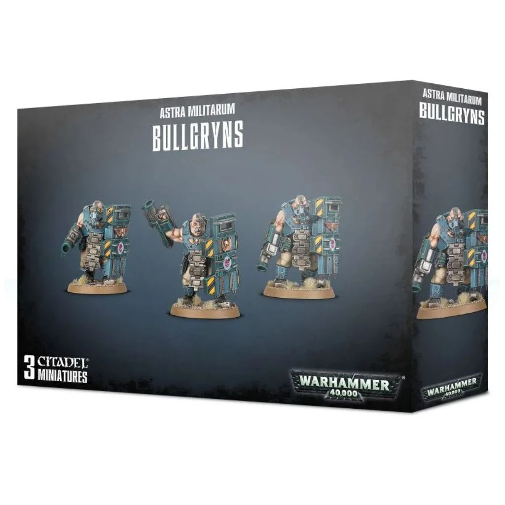 Les abhumains nommés Bullgryns sont des créatures impressionnantes. Ils sont protégés par une armure carapace réalisée à partir de divers éléments, dont des patins de char Leman Russ, et leur armement rustique mais redoutable est si lourd qu’ils sont les seuls à pouvoir le manier.