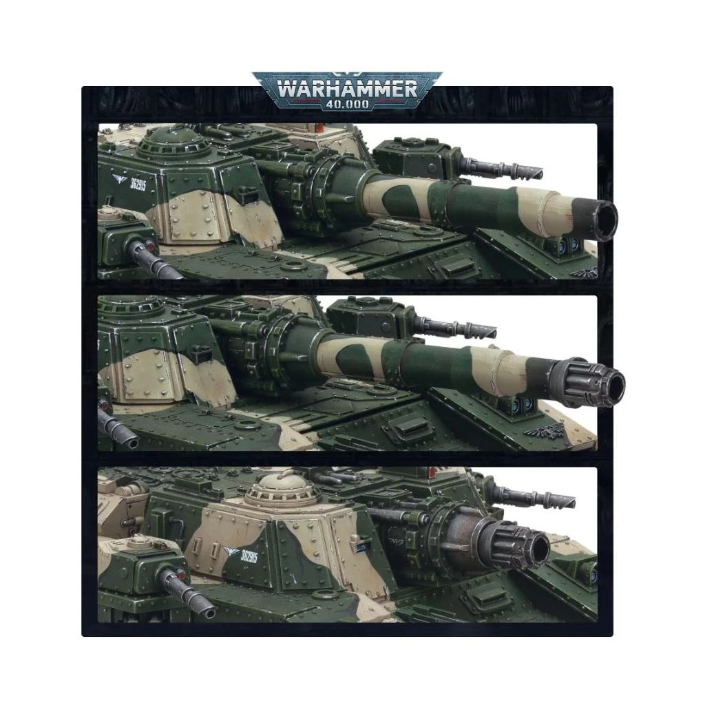 Ce kit plastique gargantuesque permet d’assembler un Baneblade super-lourd, un char tonitruant transportant un véritable arsenal et capable d’encaisser des tirs qui pourraient raser une armée entière. Si vous cherchez un pilier autour duquel articuler une puissante colonne blindée, un char super-lourd est un bon choix qui peut dévaster vos ennemis et encaisser une incroyable quantité de tirs, épargnant ainsi le reste de votre armée. Il est armé d’un puissant canon Baneblade et d’un autocanon coaxial en tourelle, ainsi que d’un canon Demolisher à l’avant de la coque, de deux canons laser sur les tourelles de flanc, d’un bolter lourd jumelé sur la tourelle de l’avant de la coque et de deux lance-flammes lourds jumelés sur les tourelles latérales et d’une mitrailleuse sur pivot sur la tourelle. Les lance-flammes lourds peuvent être remplacés par deux autres bolters lourds jumelés, et des tourelles latérales supplémentaires peuvent être ajoutées, équipées de canons laser additionnels et au choix de lance-flammes lourds jumelés ou de bolter lourds jumelés. Ça fait BEAUCOUP de puissance de feu.