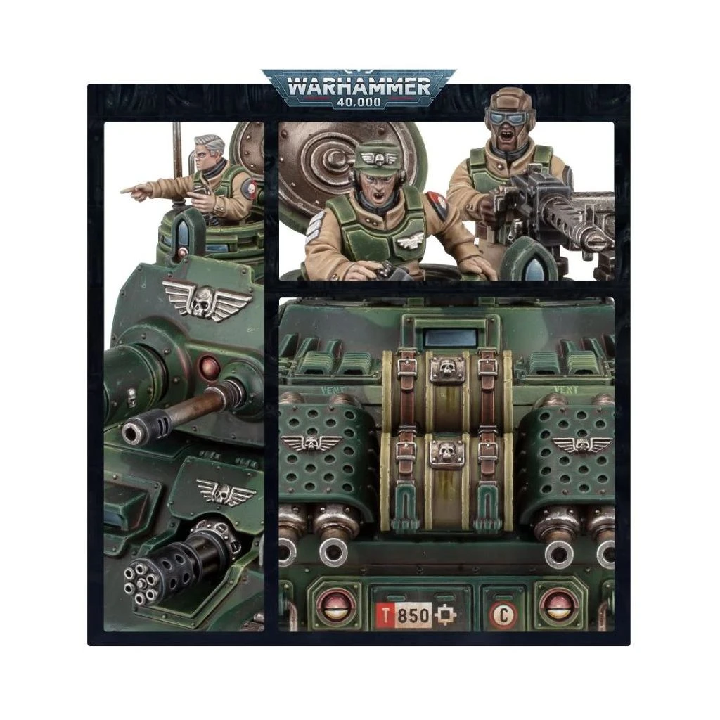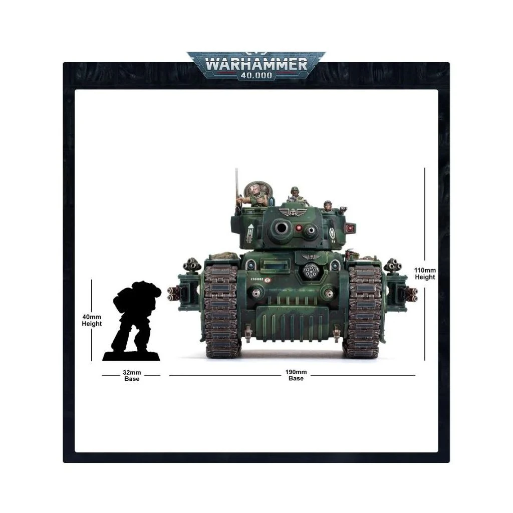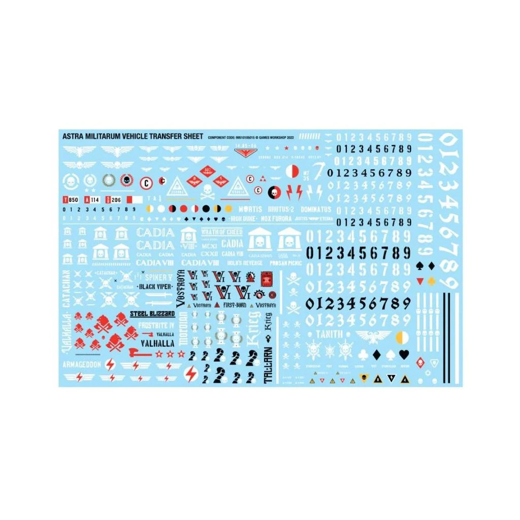 Ce kit est composé de 171 éléments en plastique et est fourni avec une planche de décalcomanies de Véhicules de l’Astra Militarum avec 475 décalcos proposant des numéros, des symboles et diverses héraldiques régimentaires. Cette figurine est fournie non peinte et nécessite assemblage