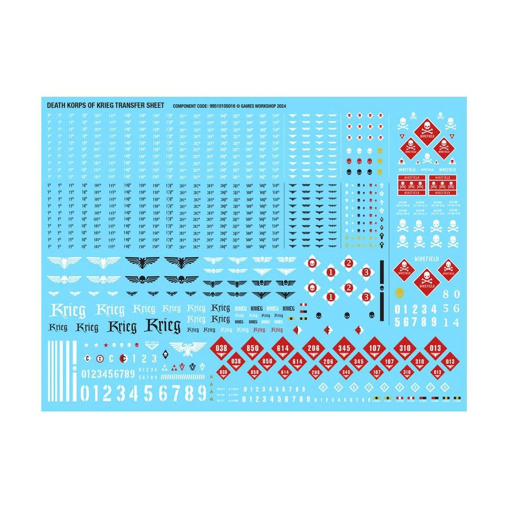 Ce kit est composé de 110 éléments en plastique, et de 1x Socle Rond Citadel de 130mm. Il contient également 1x Planche de Décalcos du Death Korps de Krieg proposant 803x décalcos pour décorer votre figurine.