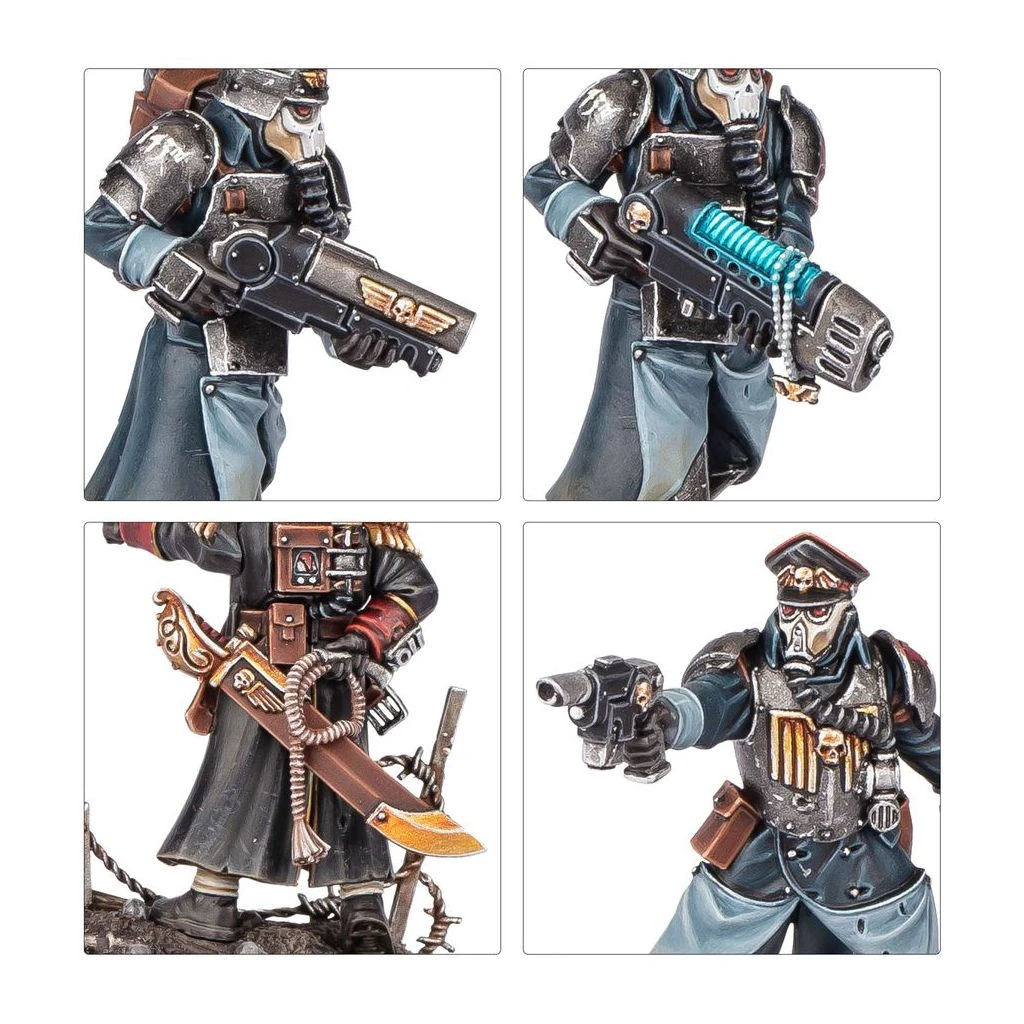 Le Seigneur Commissaire peut être équipé d’un pistolet à plasma ou d’un fouet dans sa main droite, et d’un gantelet énergétique ou d’une épée énergétique au fourreau et d’une main qui pointe pour son autre bras. Un Garde Impérial Vétéran de votre unité peut être assemblé avec un pistolet laser, un pistolet bolter ou un pistolet à plasma dans la main droite, et une épée tronçonneuse, une arme énergétique ou une matraque de tranchée dans la main gauche. Un autre Garde Impérial peut emporter au combat un bolter, un fusil à plasma, un fuseur ou un lance-grenades, avec grenades ou munitions de lance-grenades comme options d’accessoires de paquetage. Les Gardes Impériaux restants portent respectivement l’étendard régimentaire, le vox de maître, et des contre-agents alchymiques. De plus, tout un ensemble d’accessoires optionnels, dont des pelles, vous permet de décorer encore plus vos figurines.