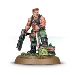 Ce kit résine contient les composants nécessaire pour assembler Sly Marbo, un garde impérial légendaire bardé de décorations. Voilà une figurine qui exsude la virilité, des muscles saillants sous son débardeur au cigare qu’il mâchouille entre ses mâchoires carrées. Son équiment se résume au minimum, car pour ce natif de Catachan, une armure n’est qu’une entrave. Il n’a que ses bottes, un pantalon de treillis (serré) et le fameux débardeur sous ses poches et bandoulières de munitions d’explosifs. Il possède un pistolet bien à lui, qui tire une grêle de projectiles capables de percer les armures et d’arrêter un gros ork en pleine course, ainsi qu’un croc de Catachan – qui est censé être un couteau, mais qui relève davantage du coupe-coupe enduit de poison violent.