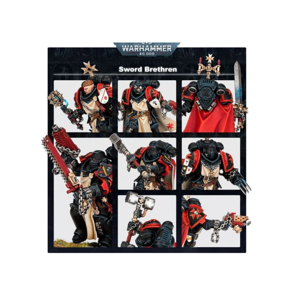 Ces guerriers vétérans se battent en employant un mélange d’armes de mêlée et de tir. Ils sont dirigés par un Castellan pouvant être équipé d’une épée énergétique de maître ou d’une tronçonneuse Astartes en main droite, et d’un pistolet bolter lourd, d’un auto-plasma, ou d’une relique en main gauche. Les quatre autres Frères d’Épée peuvent être assemblés avec différentes armes, dont un pistolet bolter lourd, un pyropistolet, un pistolet à plasma, des épées tronçonneuses Astartes, des épées énergétiques, des masses énérgétiques, une hache énergétique, une paire de griffes Lightning, ou un marteau Thunder. Ce kit inclut aussi une large gamme de têtes uniques, fleurons dorsaux, et plaques de joute.