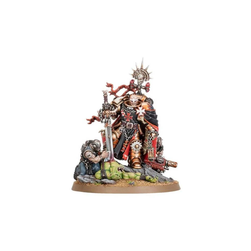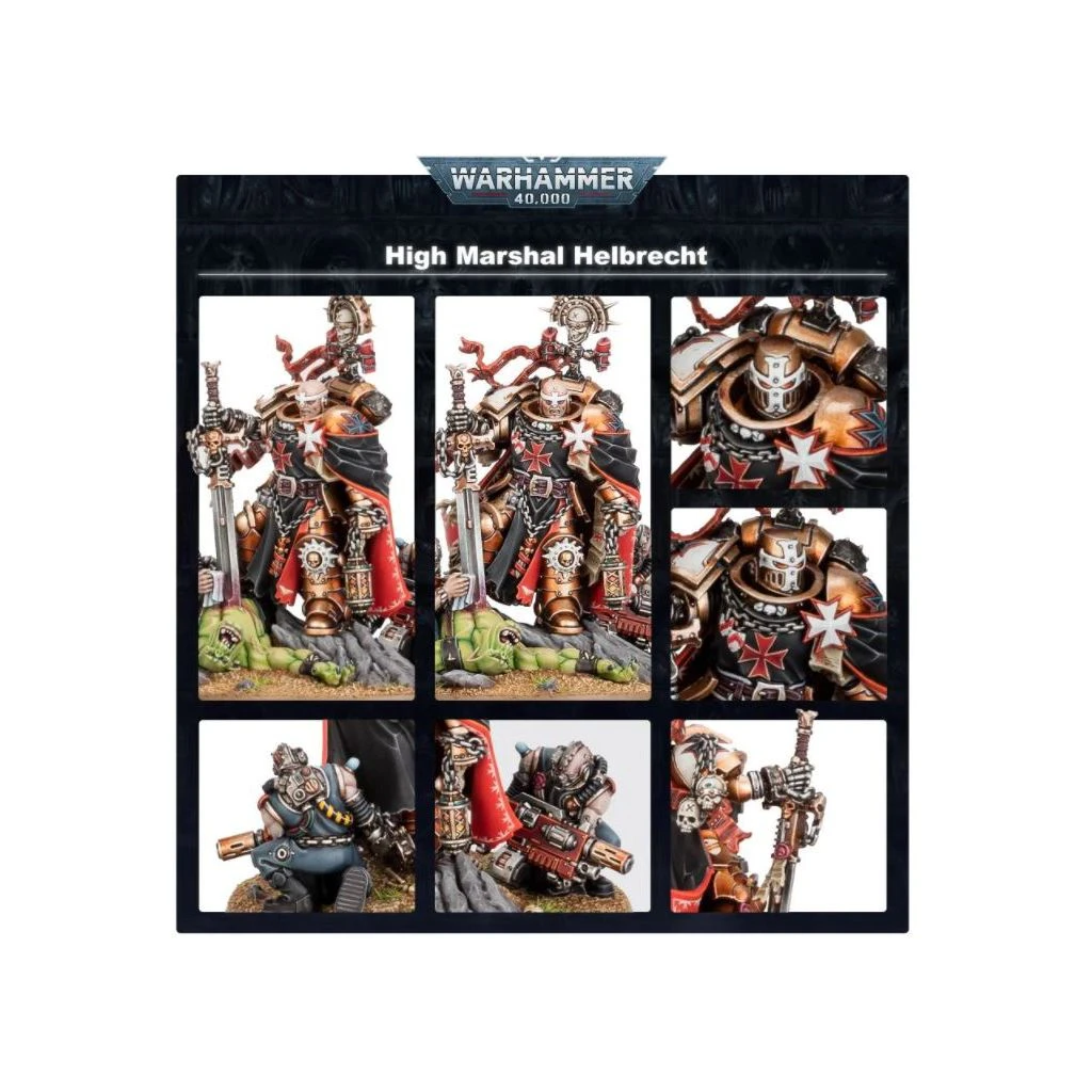 Le Grand Sénéchal Helbrecht est accompagné de deux serfs, le premier portant Férocité, son puissant combi-fuseur, tandis que le second essuie l’Épée des Grands Sénéchaux. Helbrecht exhorte les Black Templars à accomplir des hauts faits, transformant le champ de bataille autour de lui en une mêlée sanglante. Le Grand Sénéchal Helbrecht a trois choix de têtes différentes – dont deux nues – et un Ork empalé optionnel à ses pieds.