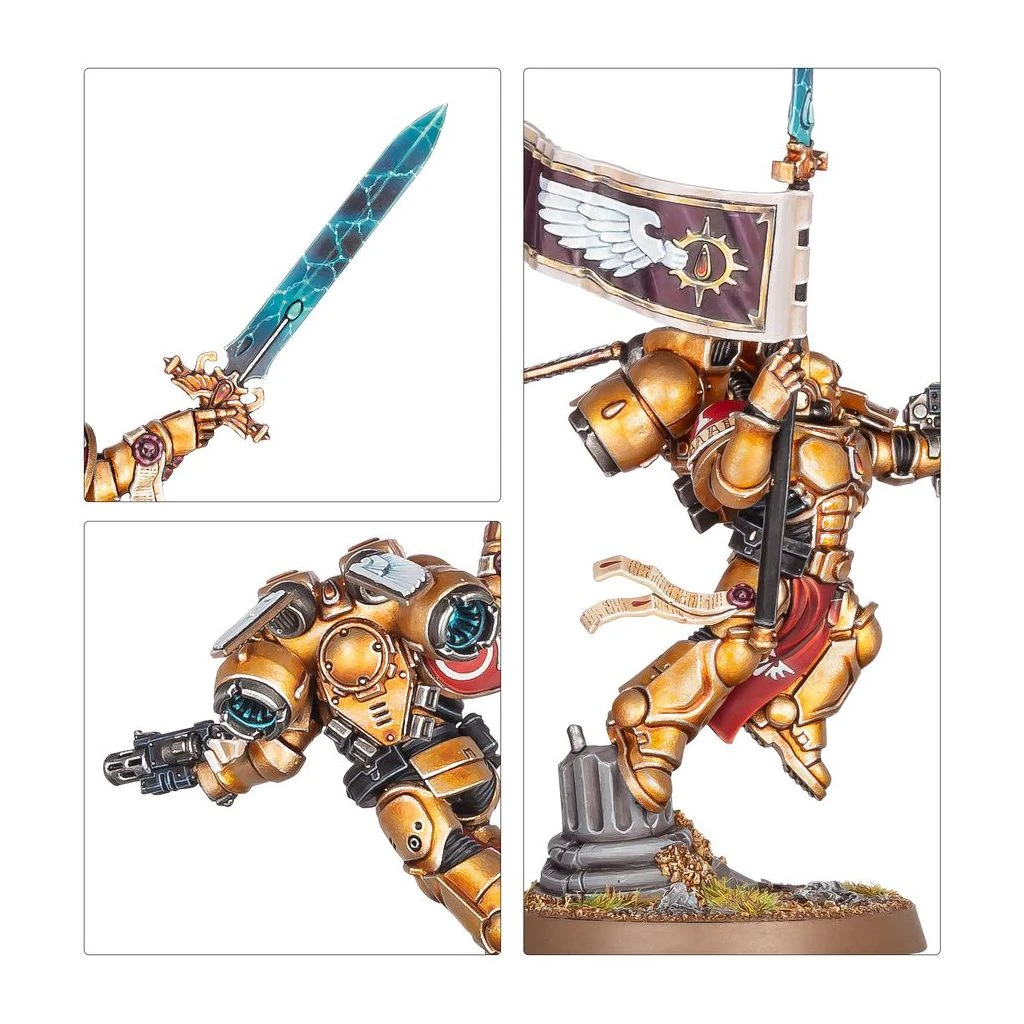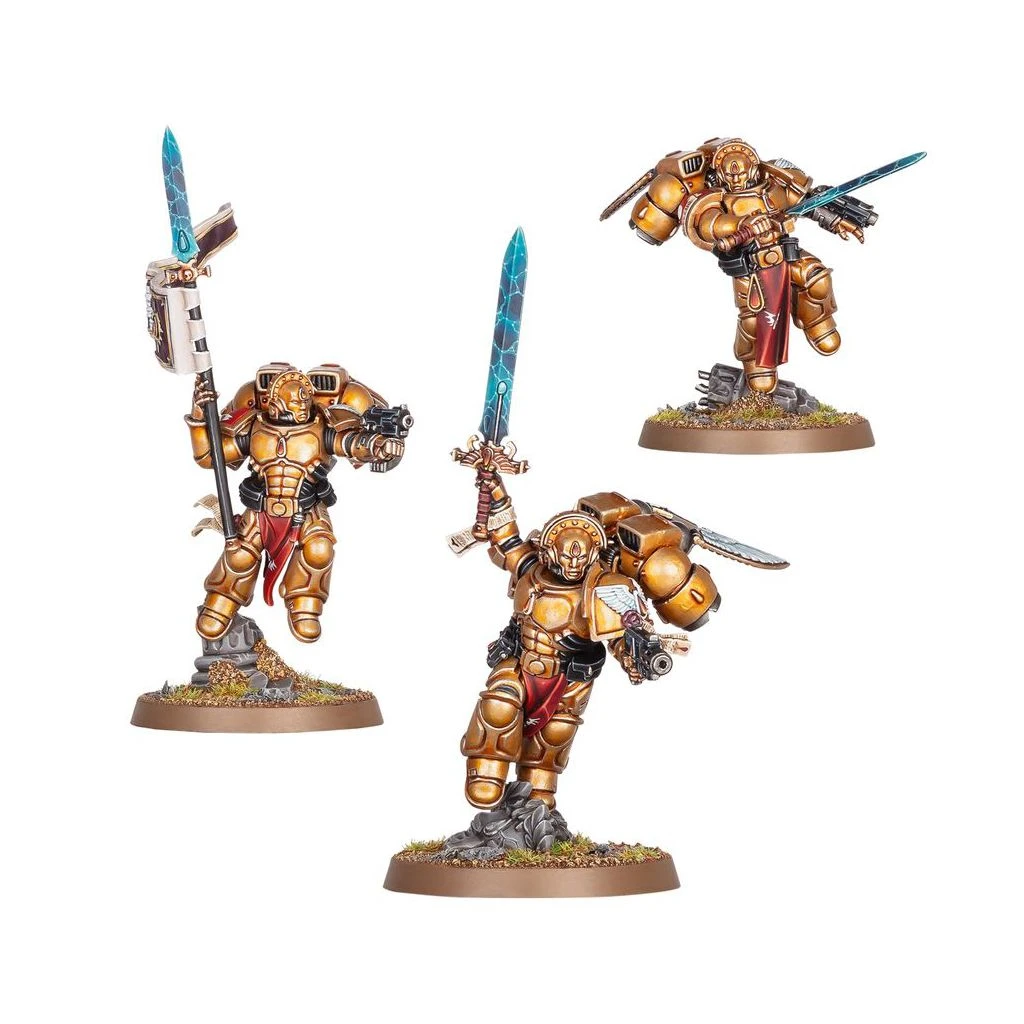Les Gardes Sanguiniens sont éprouvés de corps, d’esprit et de cœur d’une façon que peu de frères de bataille peuvent égaler. Engoncés dans des armures dorées et équipées d’armes reliques dont les origines peuvent être retracées jusqu’à l’Hérésie d’Horus, ils incarnent mieux que quiconque l’idéal de l’ange vengeur.