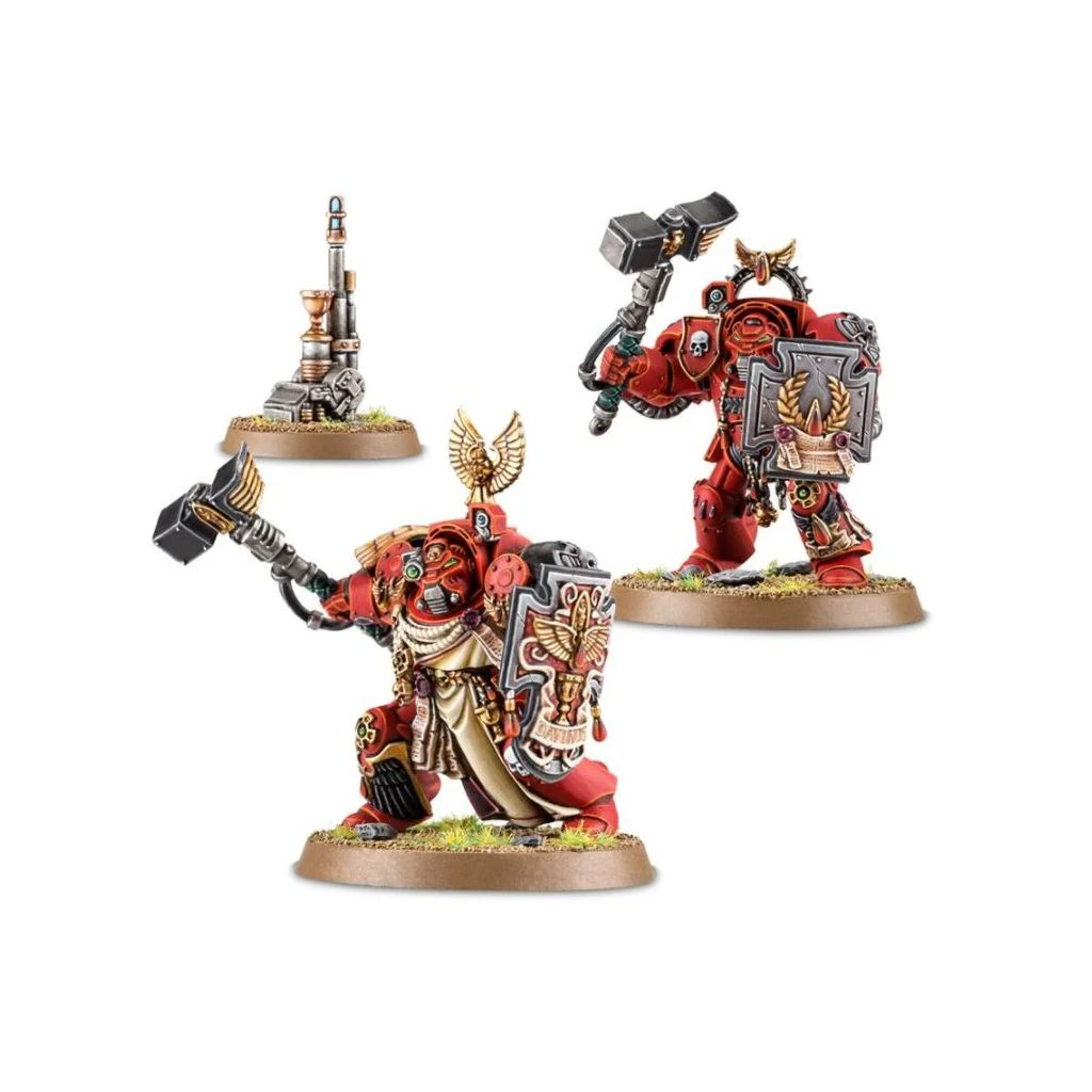 Ce kit plastique en 76 pièces permet d’assembler une Blood Angels Terminator Assault Squad de 5 hommes, armés de griffes Lightning ou de marteaux Thunder et de boucliers Storm. Les 5 paires différentes de griffes Lightning ont des ornements assortis sur les gantelets. Chaque marteau Thunder et bouclier Storm a un style différent, le sergent disposant d’un bouclier sensiblement plus grand que les autres. Il y a 5 épaulières gauches ornées de Crux Terminatus, et 8 épaulières droites différentes avec des icônes et symboles Blood Angels. Les épaulières peuvent être en outre décorées avec un choix de 12 écus. Quatre des moitiés frontales de torse sont moulées d’une pièce avec une tête casquée, et la cinquième est faite pour accueillir une des 5 têtes optionnelles du set. En outre, une figurine peut être assemblée en tant que porte-étendard de compagnie et il y a même une balise de téléportation fournie.