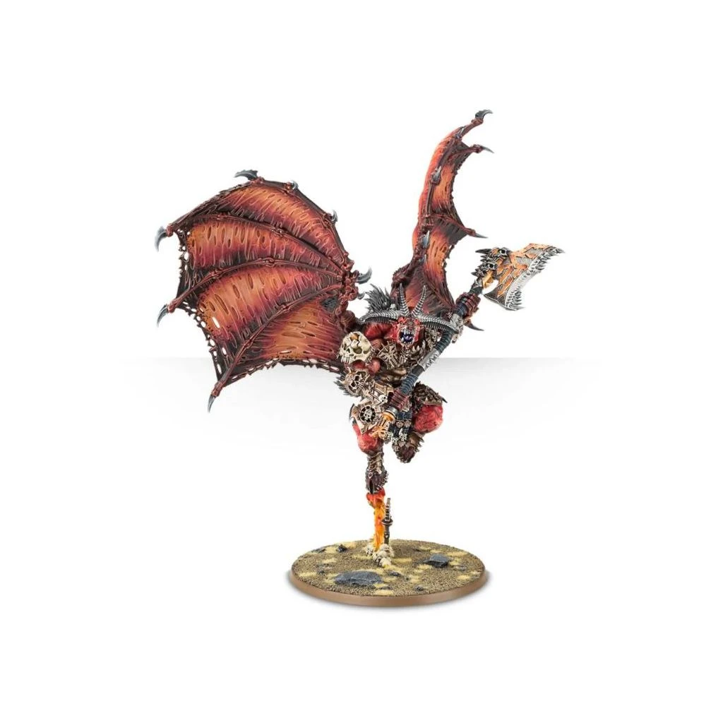 Quelle que soit la variante que vous choisissez, la figurine est proprement couverte d’iconographie de Khorne, des armes aux ailes en passant par les détails de l’armure. Vous avez le choix entre deux paires de jambes, en posture de course ou bien en plein bond sur un pilier de feu. Il y a trois moitiés frontales de torse au choix, deux modèles de plaque ventrale, deux pagnes différents, ainsi que des plaques d’armure supplémentaires en option pour les jambes et le torse. Cette figurine est à tout point de vue un véritable monstre.