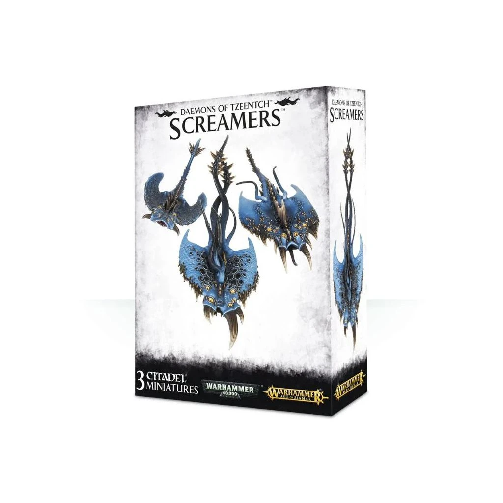 Ce kit plastique contient les composants nécessaires pour assembler 3 Screamers of Tzeentch, d’étranges raies élancées, couvertes d’yeux, de cornes et de nagoires promptes à taillader l’ennemi.