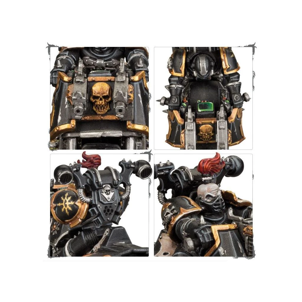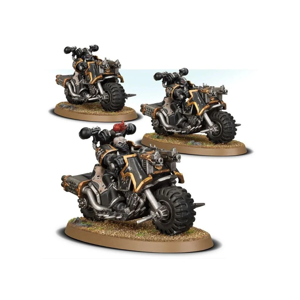 Ce kit permet de monter trois Chaos Bikers. Tous peuvent être personnalisés avec un choix de têtes, de bras, de corps et de paquetages dorsaux, de sorte à individualiser chaque Chaos Biker.