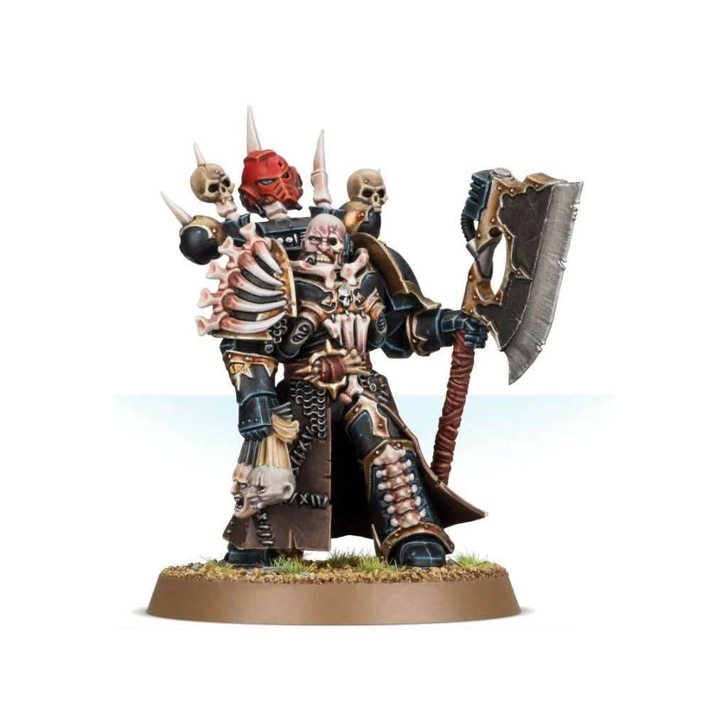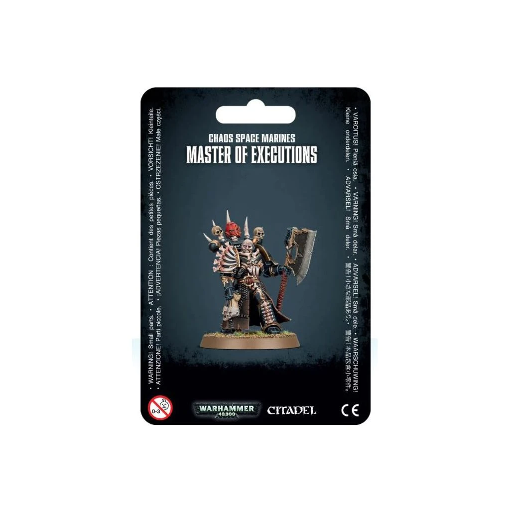 Le Master of Executions est un kit plastique de choix QG pour armée de Chaos Space Marines, dont l’unique vocation est d’éliminer les personnages ennemis avec sa redoutable (et énorme) hache de démembrement. La figurine arbore tous les attributs sinistres d’un bourreau, avec un râtelier à trophées, une armure couverte de décorations en os, et deux têtes fraîchement coupées qu’il tient de la main droite.