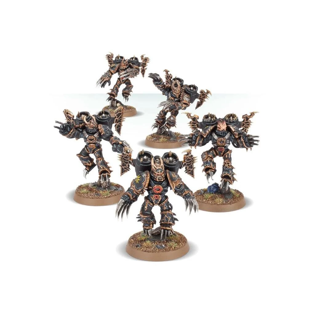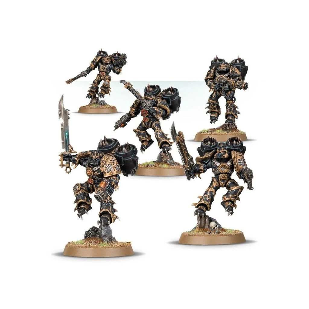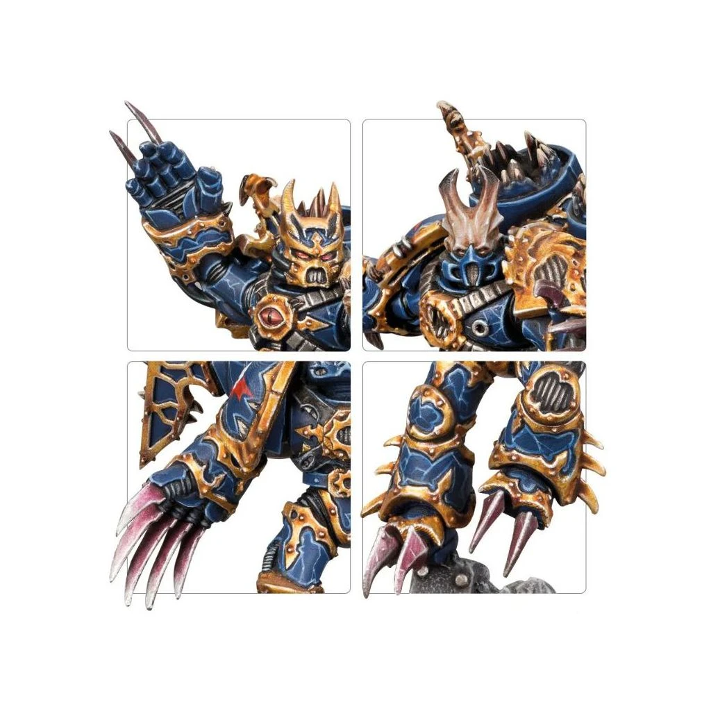 Les Warp Talons arborent des attributs barbares comme des griffes Lightning en forme de serres, des casques cornus, et des ailes sur leurs réacteurs dorsaux. On les voit perchées ou en train de décoller parmi les débris du champ de bataille. Leurs armures aux arêtes de métal présentent tous les effets corrupteurs du Warp: grilles ouvertes dans les épaulières; câbles qui dépassent des plaques d’armure; crocs crevant diverses surfaces et bordant les tuyères des réacteurs dorsaux. Ces figurines saisissantes ne demandent qu’à rejoindre n’importe quelle collection de Chaos Space Marines.