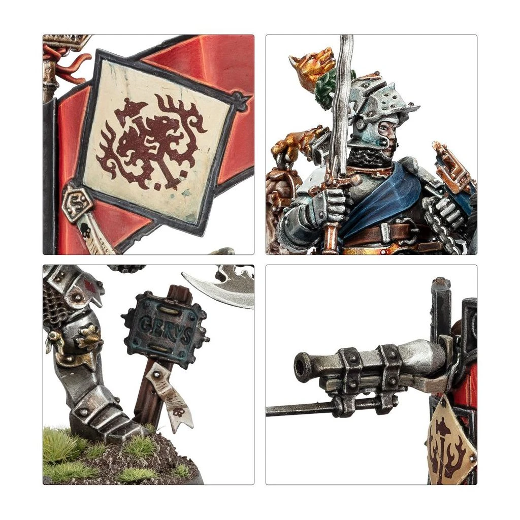Ce bataillon des Cités de Sigmar part au combat avec des unités des Guildes Franches, des Fusiliers et des Chevaliers entraînés, menés au combat par des vétérans et commandants expérimentés. Ces féroces guerriers sont soutenus par les terrifants barrages d’un Grand Canon Soudefer, et les tirs précis d’un Fusil-Major sur Ogor d’Affût, une véritable tour de château de chair et d’os.