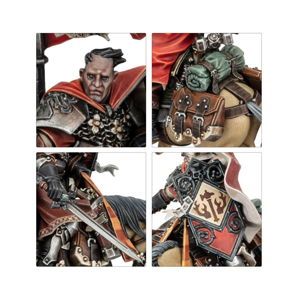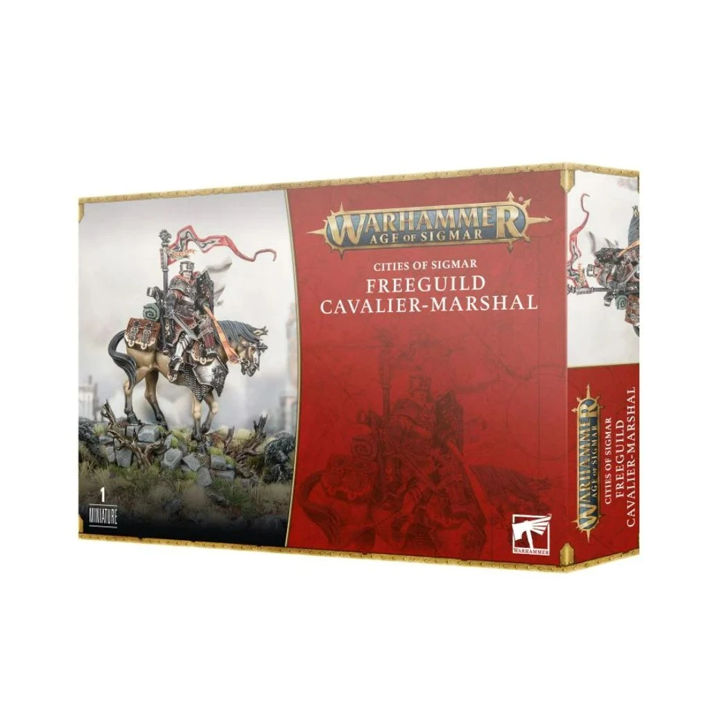 Ce kit plastique permet d’assembler un Maréchal-Cavalier des Guildes Franches, un chef chevaleresque à dos de robuste destrier. Le Maréchal-Cavalier est impressionnant dans sa plate finement ouvragée, avec son épée bâtarde de maître, sa cape et son pennon claquant au vent. Son puissant destrier est caparaçonné, et il porte aussi des provisions et armes de rechange pour une longue campagne, dont un pistolet de dragon dans son étui.