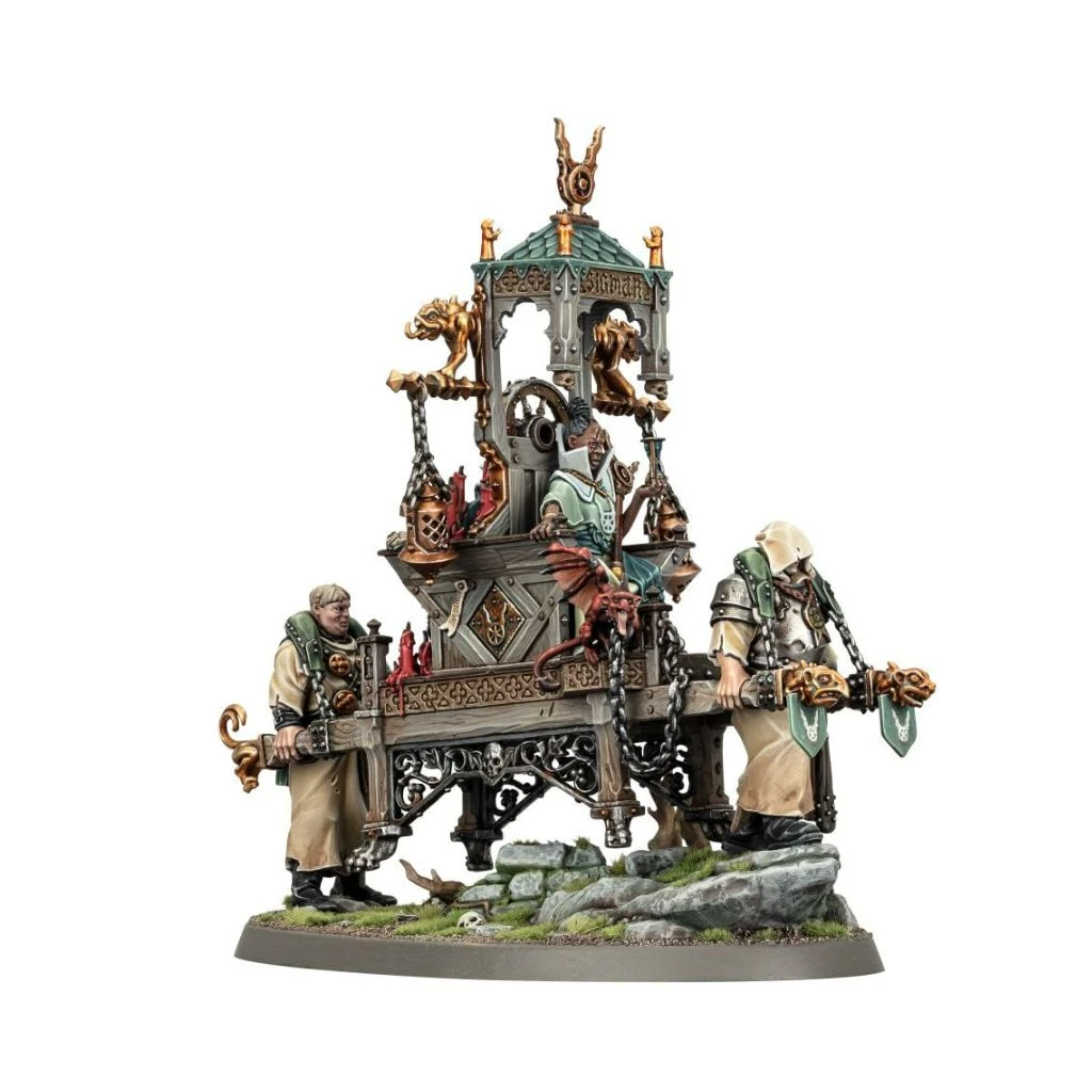 Deux acolytes dĂ©vouĂ©s, apparemment imbus d’une force divine, portent au combat le palanquin sanctifiĂ©. On peut les assembler avec un choix de quatre tĂȘtes, deux nues, deux avec capuche ou calotte, afin de personnaliser la sainte procession en accord avec l’esthĂ©tique de votre armĂ©e.