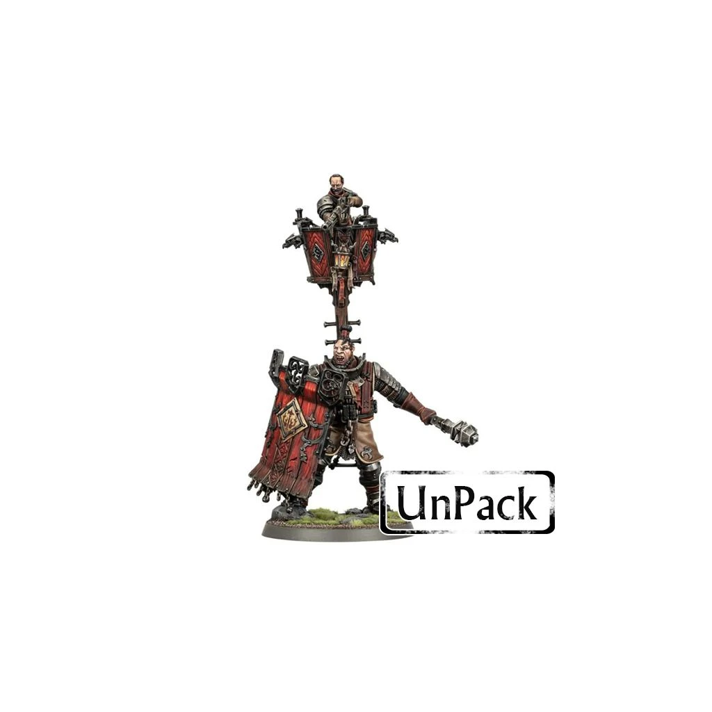 Ce kit plastique permet d’assembler un Fusil-Major sur Ogor d’Affût, officier expert en balistique, porté par son compagnon à la carrure de brute. Le Fusil-Major observe le champ de bataille du haut de son nid-de-pie agrémenté de gargouilles, de bénédictions et d’une lanterne, et élimine des cibles lointaines avec un mousquet à canon long. Son Ogor d’Affût manie une lourde masse pour repousser l’ennemi et gagne une nouvelle position de tir à grand pas avant de se barricader derrière son pavois.
