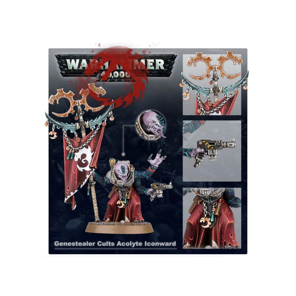 Levant bien haut la bannière sacrée de son culte, au dessus de l’anarchie frénétique de l’insurrection, l’Acolyte Iconward est un point focal religieux autant que militaire. Certains Iconwards préparent leur soulèvement depuis des siècles, et après une telle anticipation, c’est pour eux un exutoire qui se transmet à leurs frères de couvain et les rend d’autant plus belliqueux. À la vue de son étendard, ses congénères déferlent comme une vague de violence sans discrimination – une violence dont l’Iconward est lui-même pleinement capable, car rien n’édulcore ses pulsions. L’icône de l’Acolyte ne saurait en aucun cas tomber à terre, car elle représente l’aube glorieuse d’un ordre neuf.
