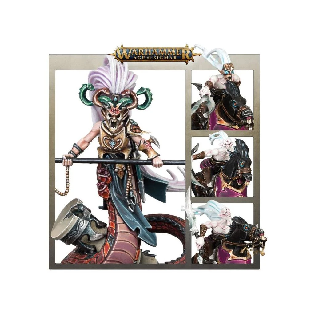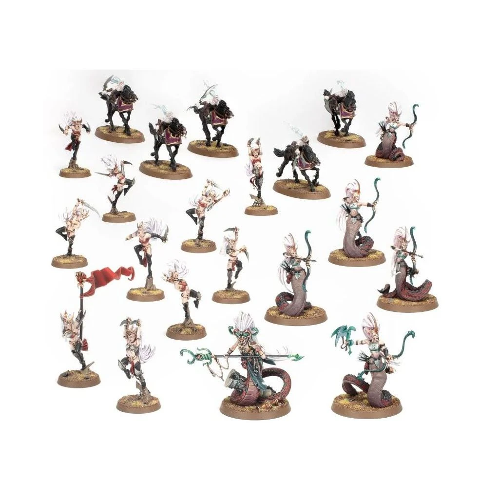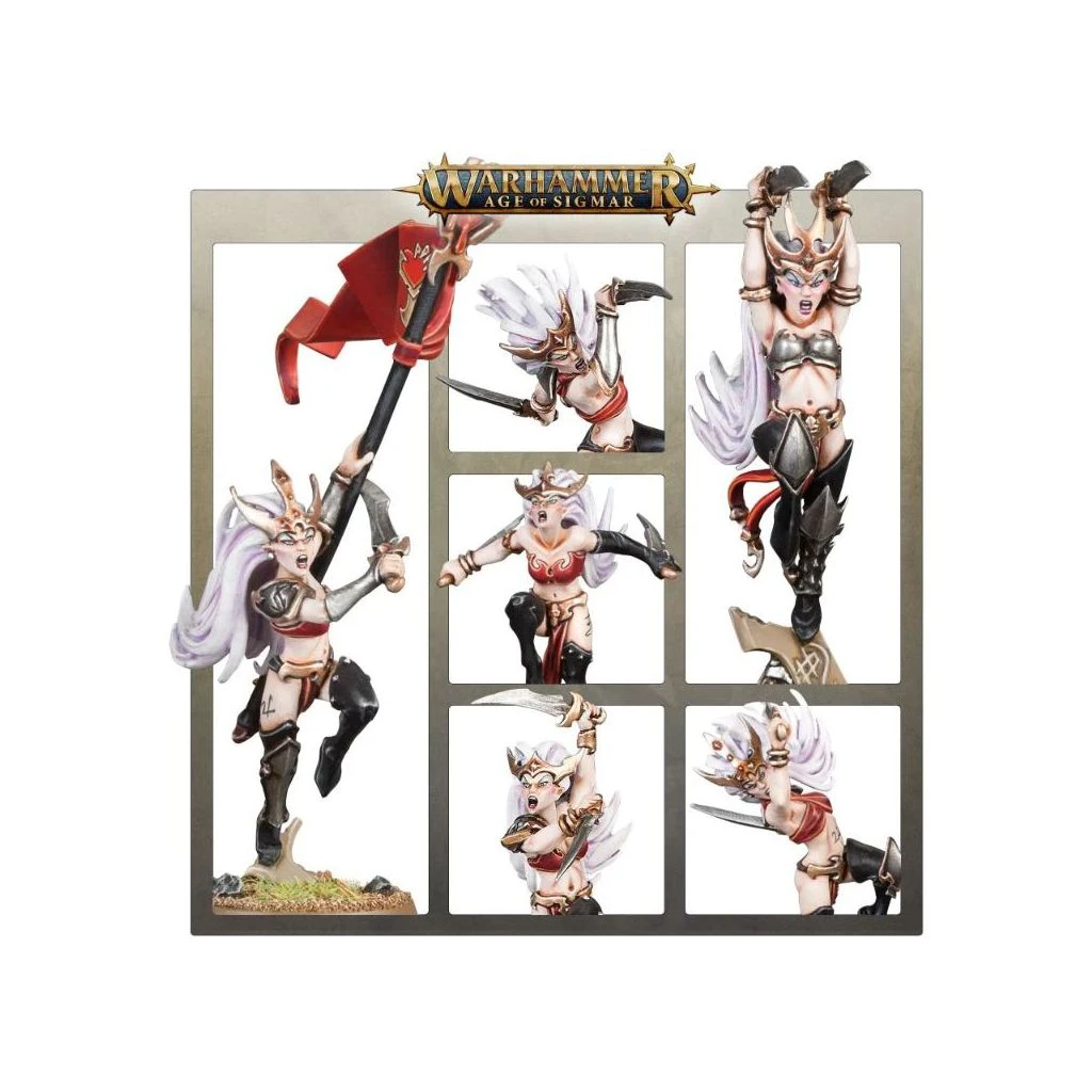 Aussi dangereuses que gracieuses, les aelfes belliqueuses des Filles de Khaine veulent verser des torrents de sang sacré au nom de leur divinité violente. Modelée à partir de gouttes du propre sang de Khaine, l’habile Ferécaille Melusaï dirige ses sœurs Rôdeuses de Sang au combat. Et tandis que les flèches cherchecœur de ces dernières sifflent dans l’air, les Conjurateurs du Feu Maudit lancent des éclairs hurlants de magie noire, et des Érinyes frénétiques se jettent dans la bataille, impatientes de faire leur offrande au Dieu à la Main Sanglante.