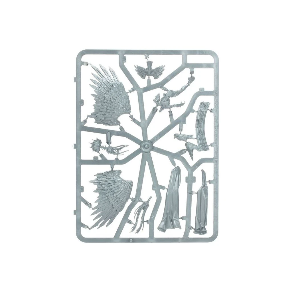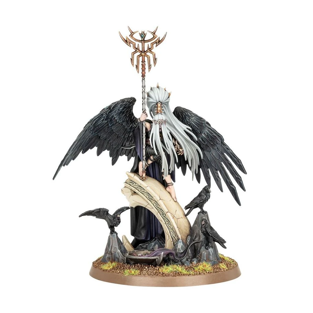 Ce kit en plastique permet d’assembler Kretusha l’Oracle-sorcière, une prophétesse réprouvée des Filles de Khaine. Kretusha manie le Bâton de Morai-Heg et porte le diadème barbelé de sa déesse sur ses yeux aveugles. Drapée de ses ailes divines, elle est perchée sur un brasero sacrificiel, entourée de familiers corbeaux tandis qu’elle scrute l’avenir.