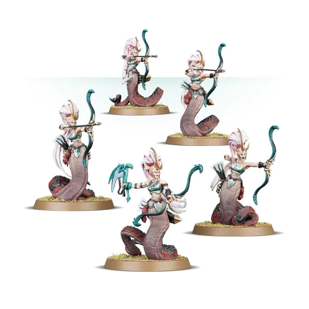 Ce kit plastique contient les composants nécessaires pour assembler 5 Blood Stalkers. La première chose qu’on remarque chez ces figurines, c’est leurs jambes, ou l’absence d’icelles – modelées à l’image de leur créatrice Morathi, leur corps en-dessous du tronc est celui d’un horrible serpent. Par ailleurs, elles portent des plastrons de métal et des carquois. Les Blood Stalkers ont des masques qui leur accordent une certaine visibilité pour pouvoir exercer leur fonction d’archères, mais pour témoigner de leur capacité au corps à corps, les figurines portent à la ceinture un couteau sacrificiel, ou scianlar. Il y a l’option de monter 1 figurine en tant que Krone, la chef d’unité: elle se distingue par son arc cherchecœur dont la poignée est ornée de deux têtes de serpent.