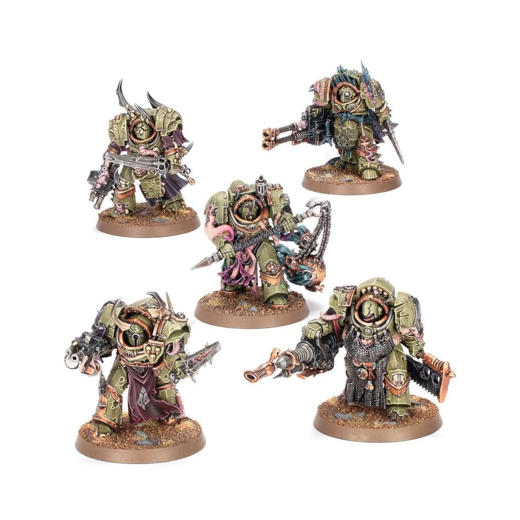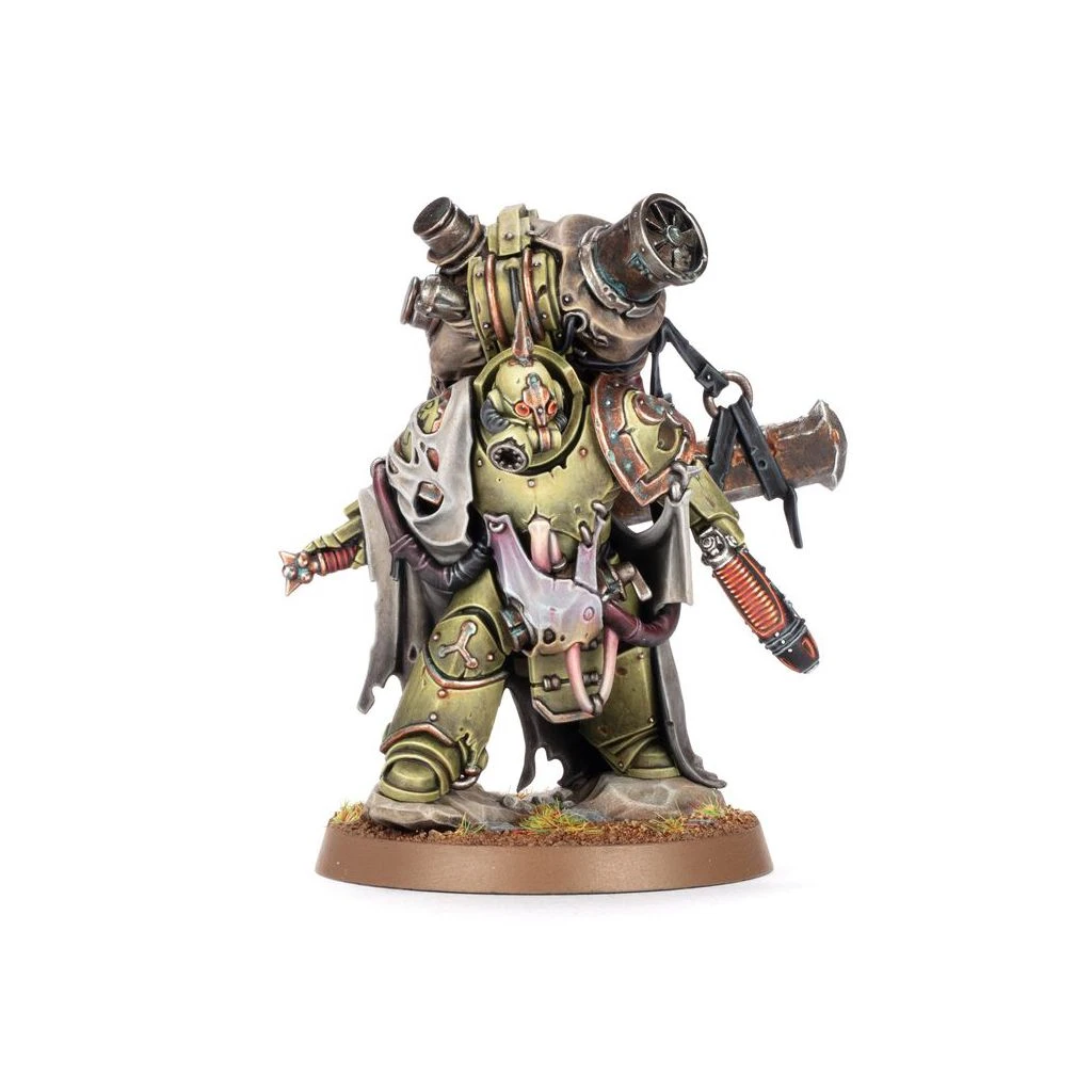 Les armées de la Death Guard se forment de la même manière qu’une blessure suppurante répand sa nécrose. De pesants guerriers purulents se rassemblent et errent jusqu’à ce qu’un meneur émerge. Un Seigneur des Véroles marche alors à leur tête, ses turbines dorsales vomissant des gerbes de fumées nauséabondes. Dans son sillage, de lourdes machines transforment la terre en boues bilieuses dans lesquelles pataugent des Space Marines infectés et corrompus.