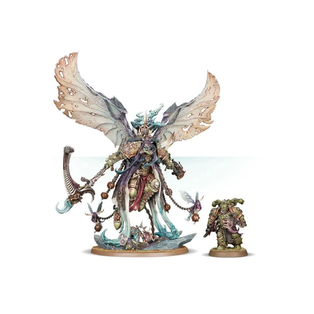Depuis dix mille ans Mortarion, Seigneur de la Death Guard, écrase ses ennemis sur le champ de bataille. Entouré de minuscules démons bruissants, de mouches bourdonnantes et de vapeurs pestilentielles, Mortarion plonge au combat porté par ses grandes ailes. Leur battement sonore remplit l’ennemi d’effroi tout en diffusant la puanteur de la mort parmi ses lignes. La simple présence du Seigneur de la Mort est fatale, car ses adversaires s’étouffent, s’écroulent et succombent à la myriade de maux qui saturent l’air autour de lui.