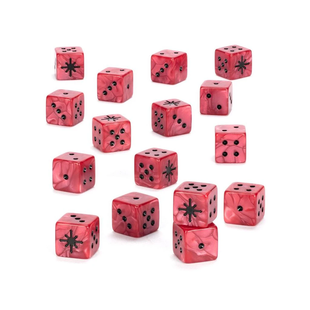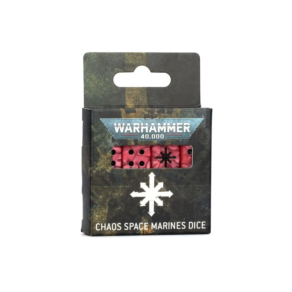 Un set de 16 dés à six faces pour les parties de Warhammer 40,000, sur le thème des Space Marines du Chaos. Ces dés sont moulés dans un sinistre plastique rouge sang nacré avec des marquages noirs. Les faces 1 à 5 affichent une numérotation classique, mais chaque face du 6 est frappée de l’icône du Chaos, l’étoile à huit branches.