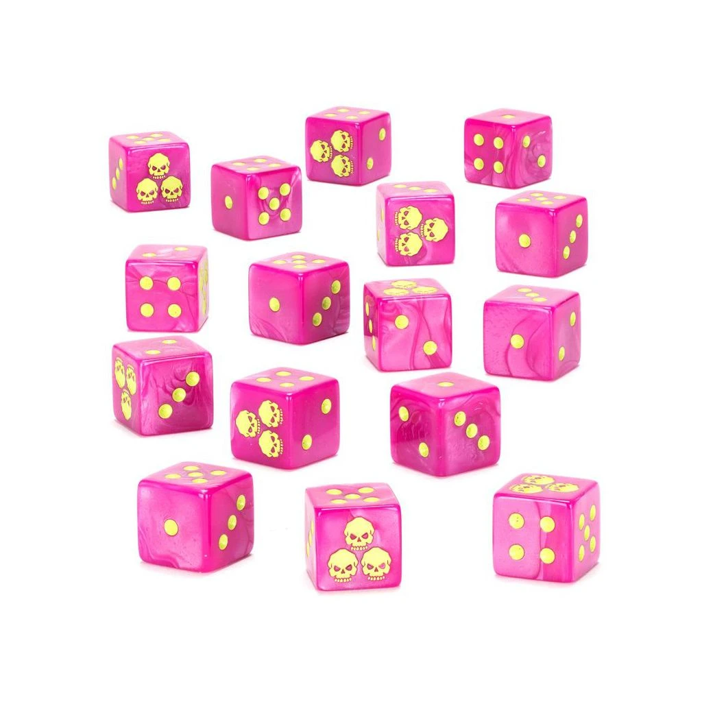 Ce set comprend 16 dés à six faces aux arêtes carrées à utiliser pour vos parties de Warhammer 40,000, sur le thème de la Death Guard. Ils sont moulés en plastique acrylique violet à effet nacré avec des marquages verts, et mesurent 16mm de côté. Les faces de 1 à 5 sont numérotées par des points de façon traditionnelle, et chaque face du 6 est décorée de l’icône bénie de la Death Guard.