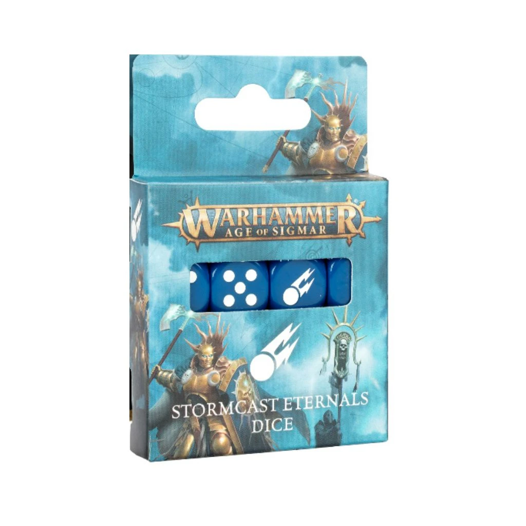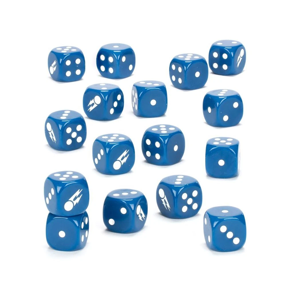 Ces dés cubiques de 16mm aux arêtes arrondies sont moulés en plastique d’un bleu royal. Les marquages blancs sont bien lisibles, et les faces du 6 arborent l’icône des Éternels de l’Orage.