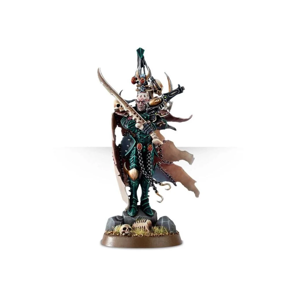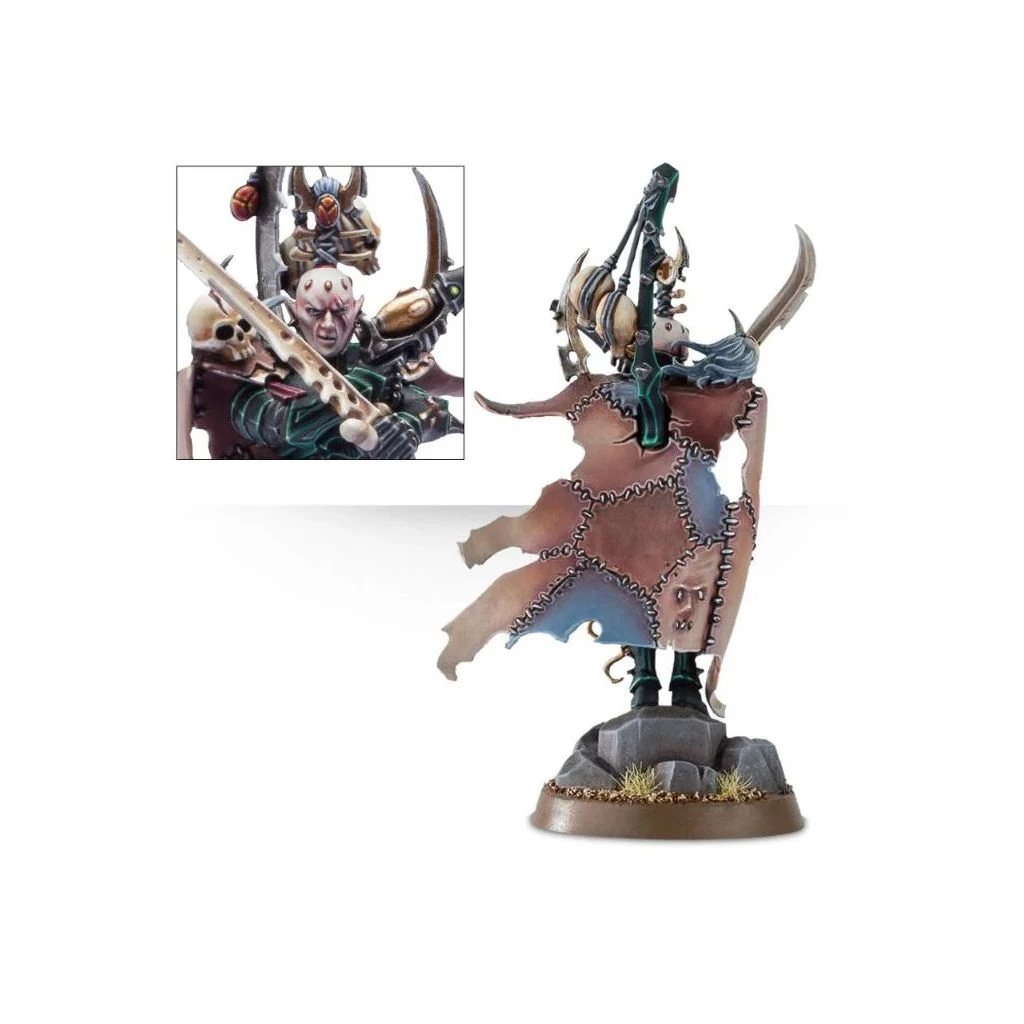 Ce kit plastique de 11 pièces permet d’assembler un Archon en armure kabalite gravée de runes. L’Archon tient une lame dessiccante et un pistolet éclateur, et il porte une cape de peau et un râtelier à trophées pour exhiber fièrement les horreurs qu’il a commises au combat.