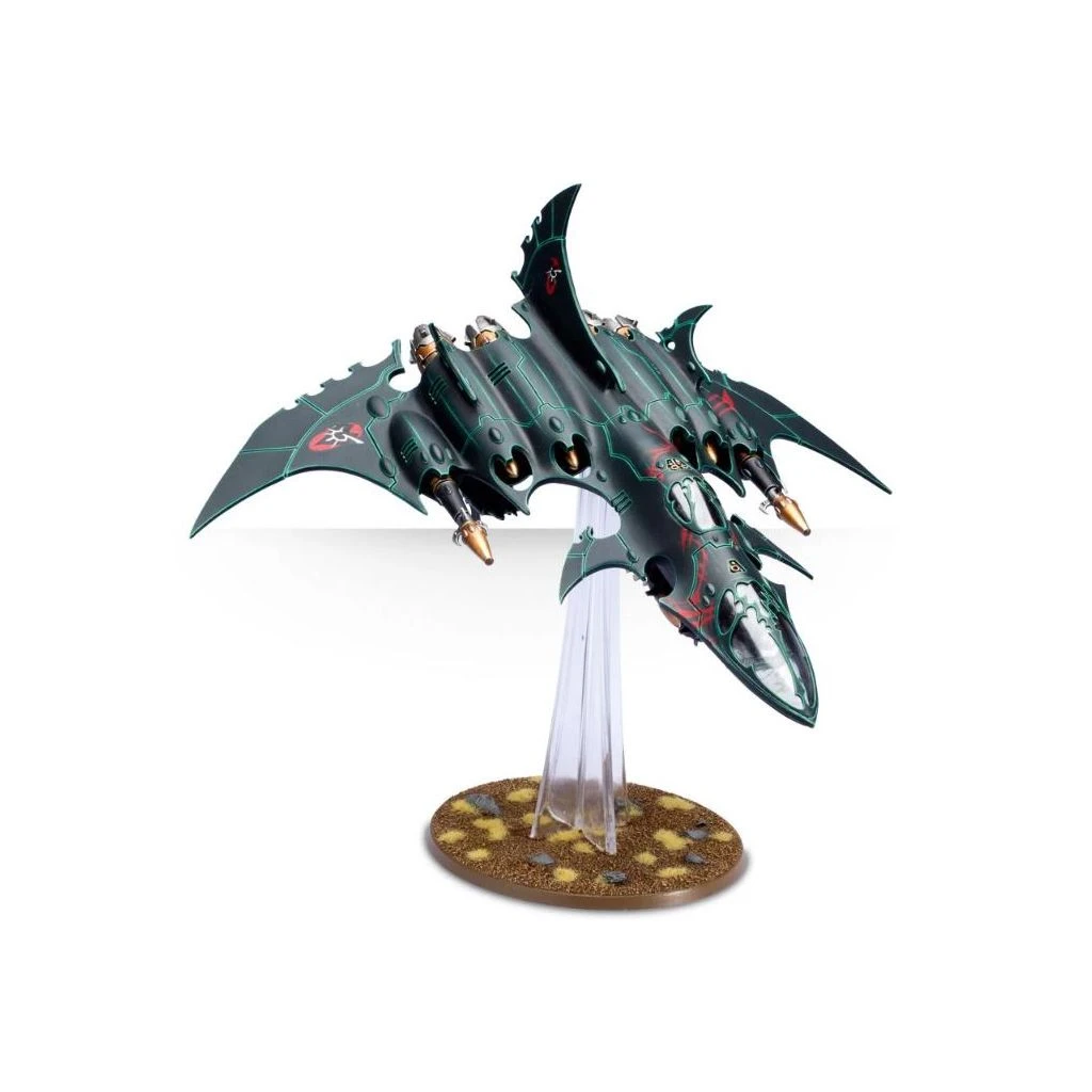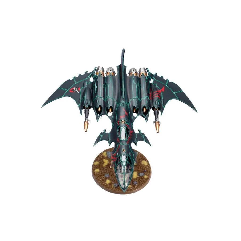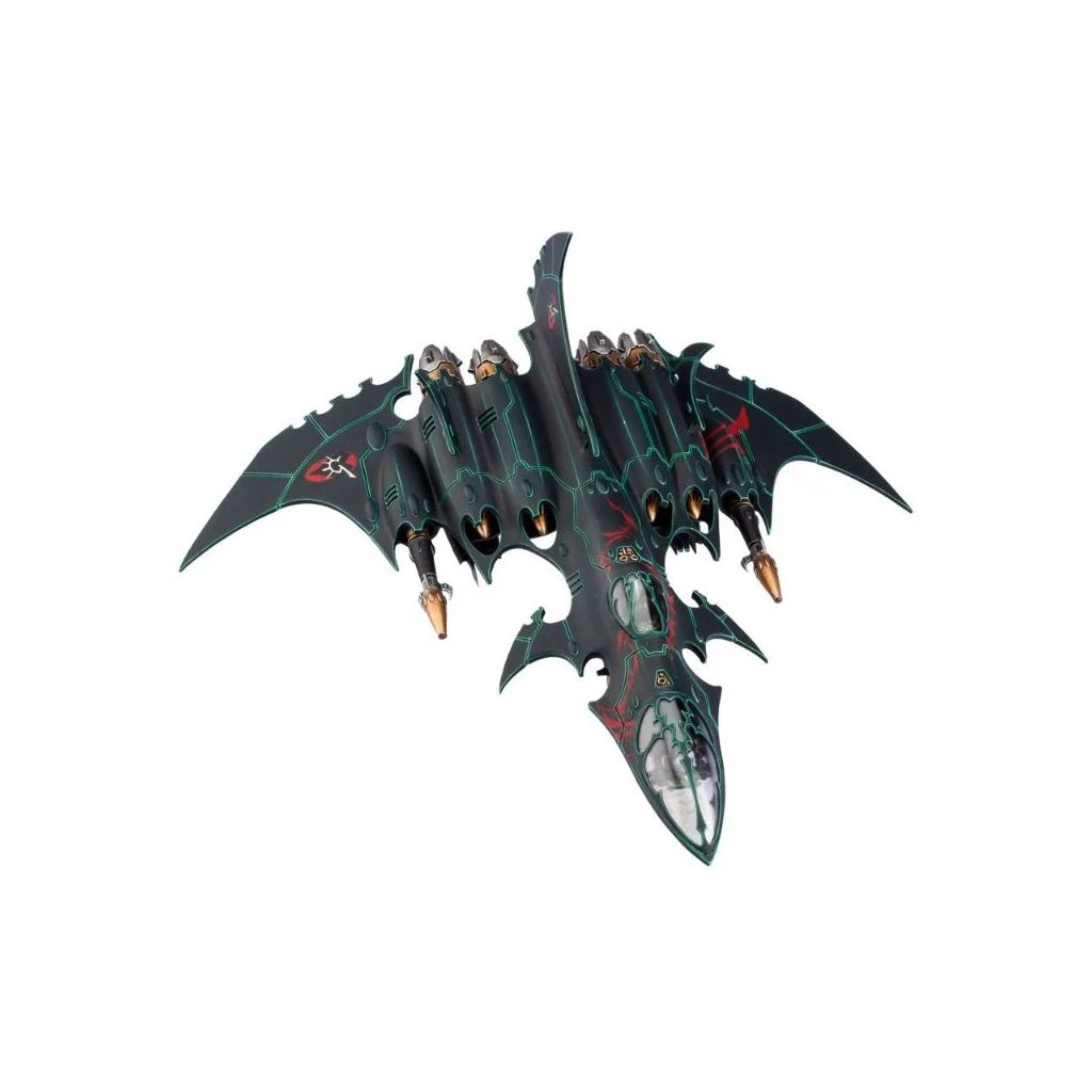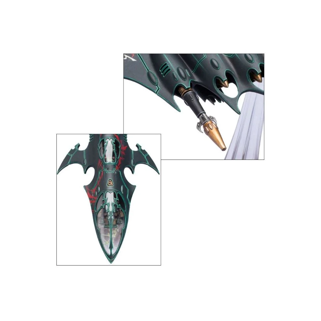 Ce kit plastique de 71 composants représente une formidable pièce centrale. Une fois assemblé, cet engin imposant fait près de vingt-quatre centimètres d’envergure. Le poste de pilotage domine le fuselage du Voidraven, juste en retrait de la verrière cristalline de l’opérateur d’armements, couché dans le nez de l’aéronef où il sélectionne ses cibles à l’aide des affichages tactiques sculptés dans la verrière en plastique transparent. Le Voidraven est propulsé par quatre réacteurs noyés dans les emplantures de ses ailes en delta incurvé, qui suivent les mêmes canons esthétiques que le chasseur Razorwing.