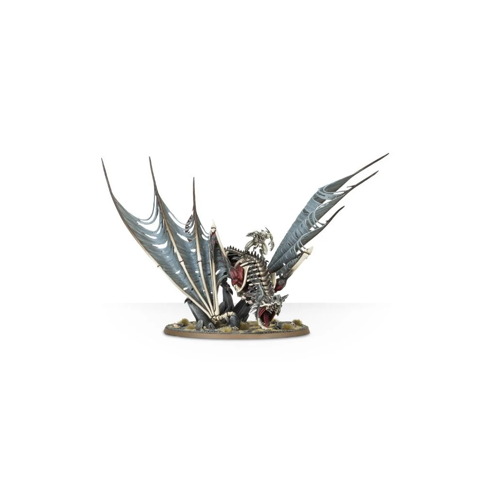 L’Abhorrant Ghoul King sur Zombie Dragon est une figurine imposante dont la présence se remarque dans n’importe quelle collection. Le Zombie Dragon est une énorme carcasse animée, dont les ailes en lambeaux tendues sur des os dénudés sont mues par d’épais muscles à vif. Son crâne monstrueux est garni de crocs, d’entre lesquels darde une longue langue. Il a pour cavalier un Ahorrant Ghoul King.