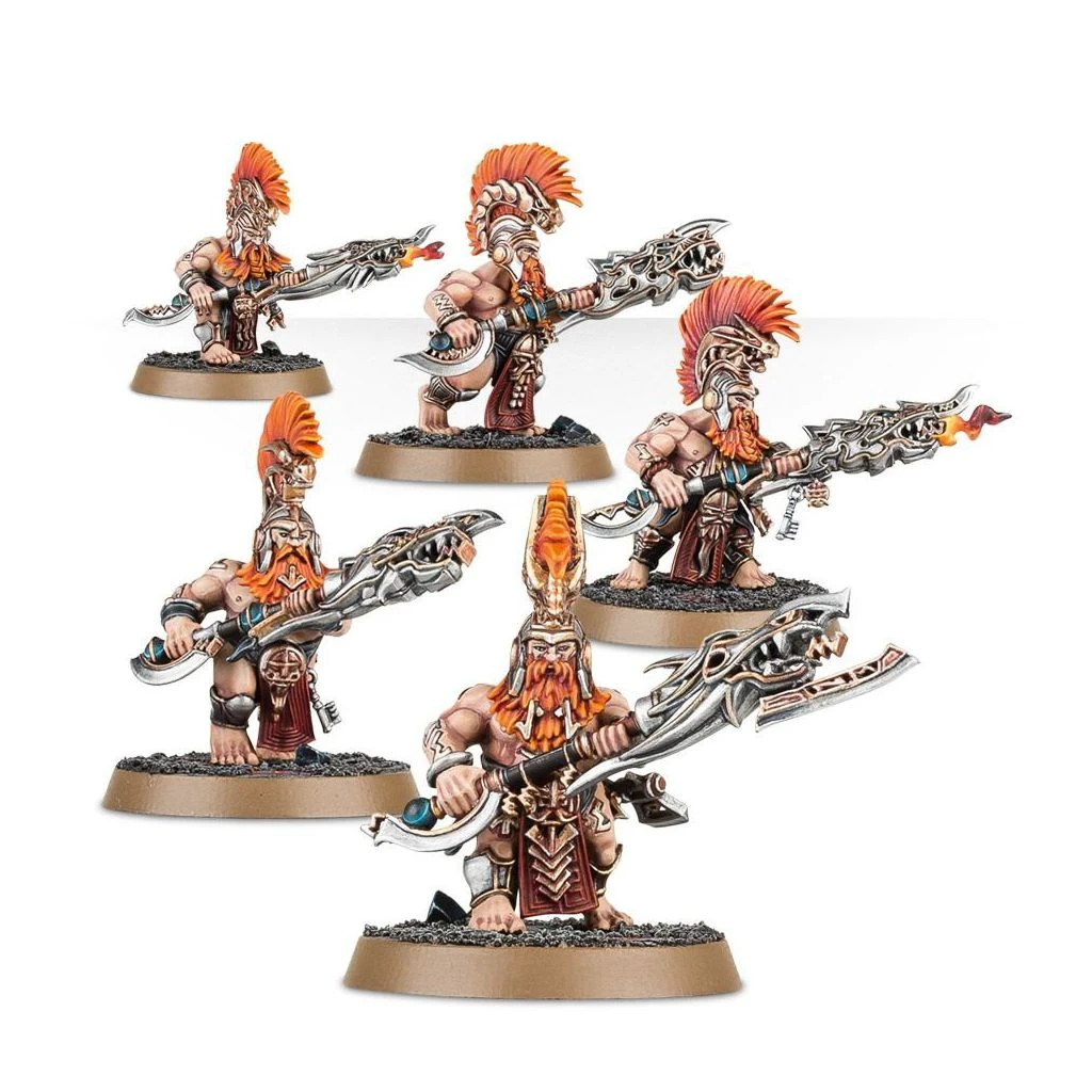 Ce kit plastique contient toutes les pièces nécessaires pour assembler cinq Hearthguard Berzerkers, armés de doloires de berzerker à deux mains et de haches de jet de pyracier. Très peu protégés, la chair incrustée de rune d’ur-or, ils arbirent des barbes démesurées et des crêtes de cheveux qui dépassent de leurs heaumes de drac. On peut, au choix, les équiper de bardiches claqueflammes, et une des figurines peut être assemblée en tant que Karl, le chef d’unité, nanti d’une crête spéciale et d’une hache modifiée.