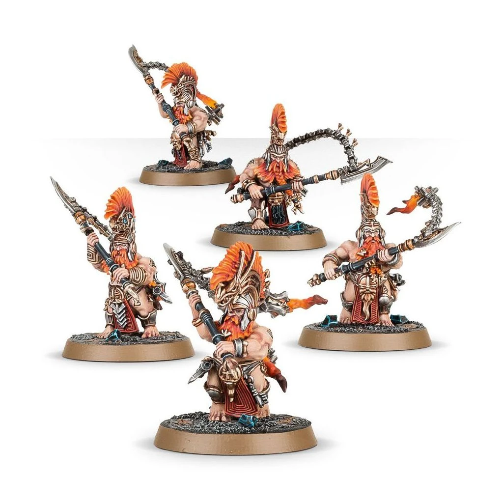 Guerriers d’élite incroyablement puissants, peut-être les plus forts de leur loge, les Hearthguard Berzerkers sont les premiers à répondre à l’appel du cor des Fyreslayers. Pleins d’ardeur et de détermination, baignant dans la lueur des runes d’ur-or incrustées dans leur chair, ils sont pressés de déchaîner la fureur des Fyreslayers contre l’infortuné ennemi. Protecteurs du Runefather et de ses fils, ces guerriers implacables décrivents des arcs mortels avec leurs bardiches claqueflammes, qui fendent sans peine les meilleures armures du Chaos. Leurs lourdes chaînes et leurs braseros incandescents accentuent l’impact de leur assaut dévastateur.