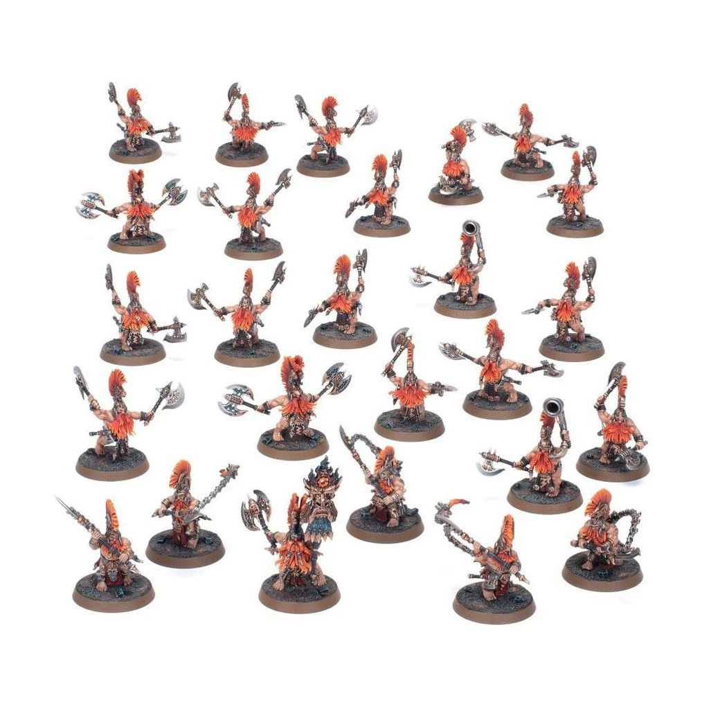 Ce Régiment de Renom est dirigé par un Exilé Sans-fort, un Héros vaillant disponible pour la première fois dans cette boîte, accompagné de Berserkers Âtregardes, d’Âtregardes Auriques et de Berserkers Vulkites. La boîte contient toutes les figurines dont vous avez besoin pour aligner les Porteflammes de Fjori, dont les règles de Régiment de Renom et les chartes d’unité sont disponibles dans Éophores: Émissaires. C’est également un très bon moyen de renforcer votre collection de Pyrotueurs et de faire des économies par rapport à un achat au détail.