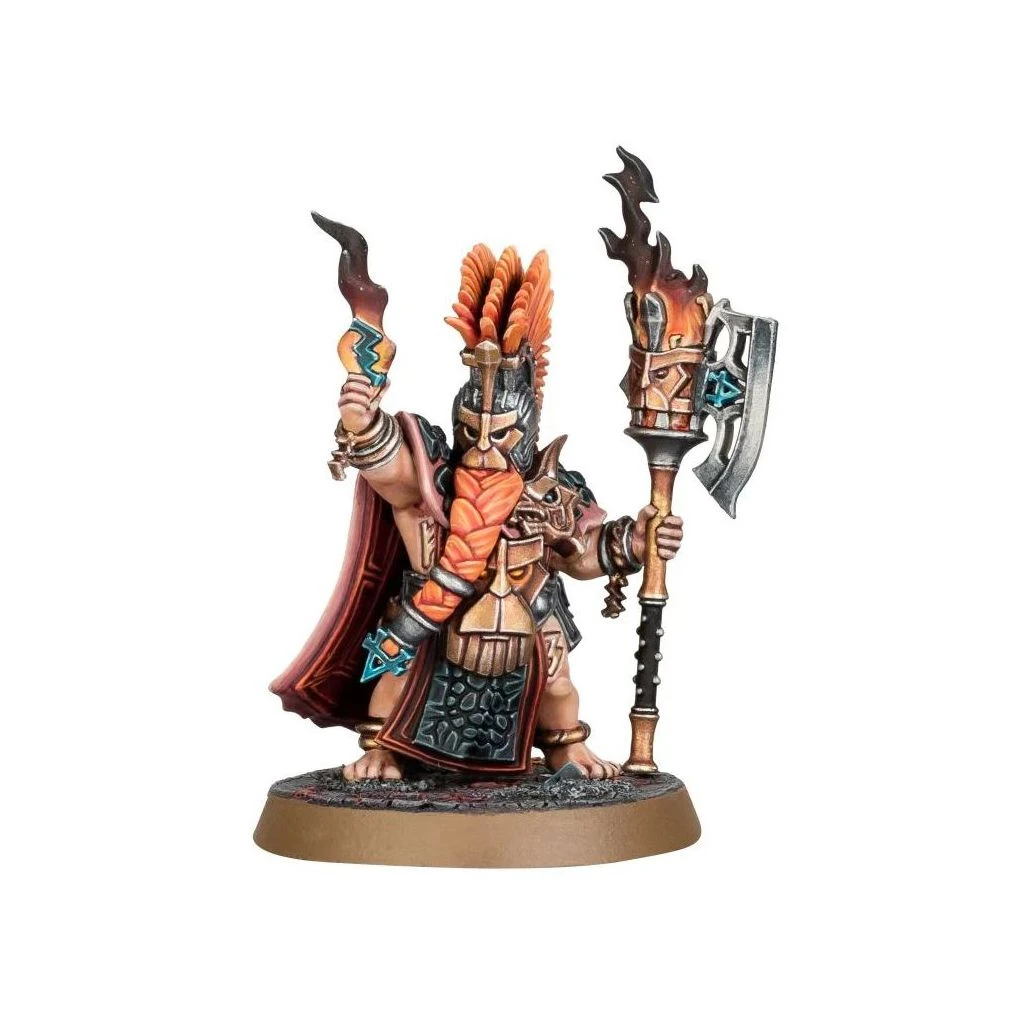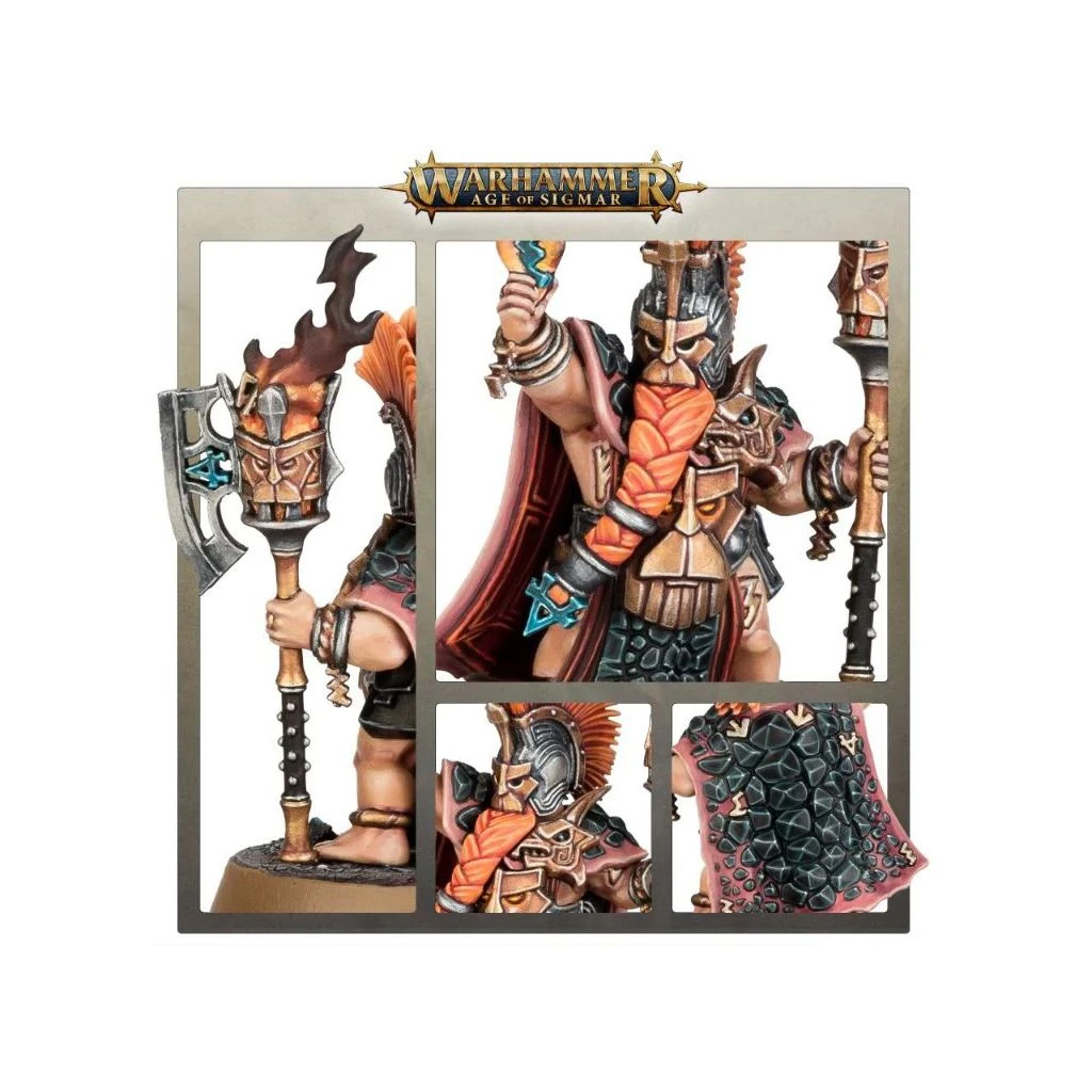 Ce kit plastique permet d’assembler un Gardefeu Aurique, Un Héros et Totem de soutien funéraire pour les armées de Pyrotueurs. Paré d’une cape sacrée en peau de salamandre et d’un austère masque mortuaire, ce duardin brandit la Rune Majeure de Flamme d’une main et tient une hache à brasero enflammée dans l’autre. Au combat, ce prêtre-guerrier se faufile jusqu’au cœur de la mêlée, et puise dans la puissance de l’ur-or récolté sur ses camarades tombés pour activer un effet magique parmi plusieurs.