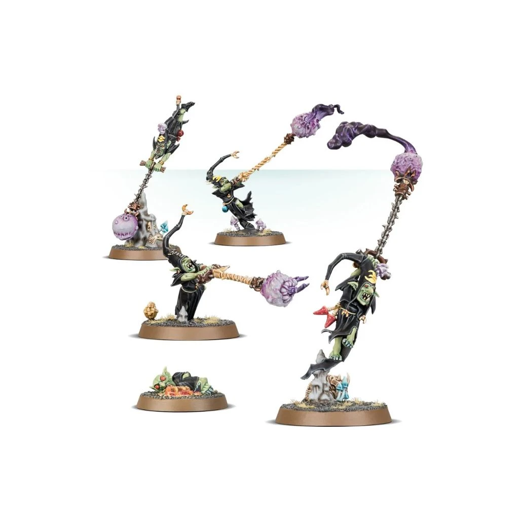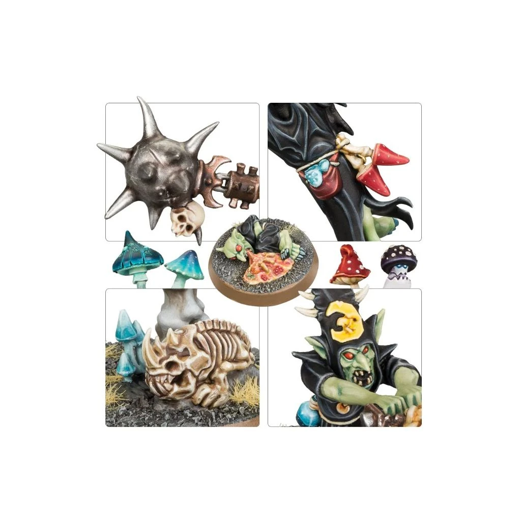 Ce kit permet de monter 5 Loonsmasha Fanatics ou 5 Sporesplatta Fanatics. Il est riche en détails et offre de nombreuses pièces en sus, dont un squelette de squig, des champignons et un Grot malade – de quoi mettre de l’ambiance sur les socles de votre choix.