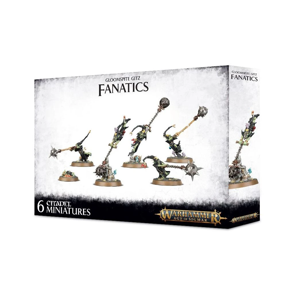 Fanatics forment une unité d’attaque surprise meurtrière propre à l’armée Gloomspite Gitz. Avant le début de la partie, vous avez la possibilité de les cacher au sein de vos autres unités, afin de les révéler au moment opportun pour attaquer brutalement.