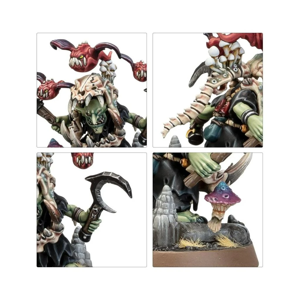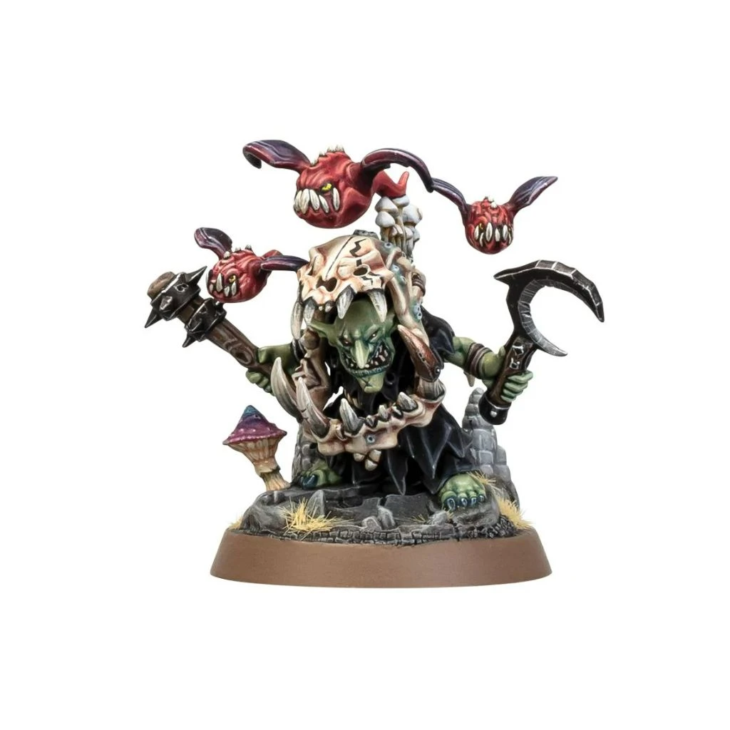 Ce kit plastique permet d’assembler un Fôteur d’Troubles, un démagogue Luneclans pour les Vils du Fielobscur. Protégé par son imposante armure en crâne de squig, ce chef bruyant plonge les monstres cavernicoles dans une frénésie écumante. Si un ennemi s’approche trop, le Fôteur d’Troubles le lacérera de sa serpe-lune et de sa kogneuse, tandis que sa volée couinante de squigs chauve-souris gavés de champignons plongera sur ses ennemis avant d’exploser.